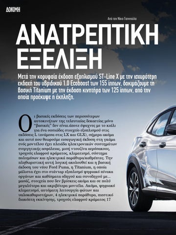 ΑΝΑΤΡΕΠΤΙΚΗ ΕΞΕΛΙΞΗ Μετά την κορυφαία έκδοση εξοπλισµού ST-Line X µε την ισχυρότερη εκδοχή του υβριδικού 1.0 Ecoboost των 155 ίππων, δοκιµάζουµε τη βασική Titanium µε την έκδοση κινητήρα των 125 ίππων, από την οποία προέκυψε η έκπληξη.