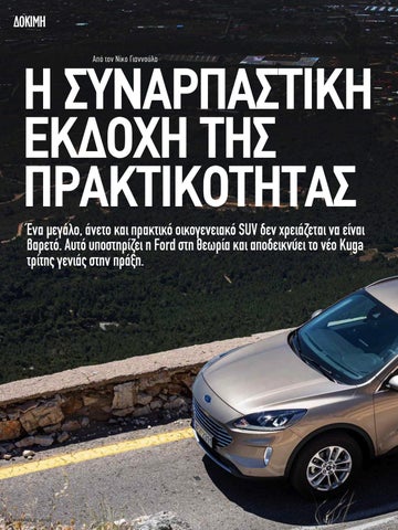Η ΣΥΝΑΡΠΑΣΤΙΚΗ ΕΚΔΟΧΗ ΤΗΣ ΠΡΑΚΤΙΚΟΤΗΤΑΣ Ένα µεγάλο, άνετο και πρακτικό οικογενειακό SUV δεν χρειάζεται να είναι βαρετό. Αυτό υποστηρίζει η Ford στη θεωρία και αποδεικνύει το νέο Kuga τρίτης γενιάς στην πράξη.