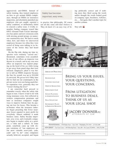 | EDITORIAL | aggressively anti-OSHA. Instead of safety training, they trained employees on how to get around OSHA compliance, through an OSHA (or insurance) inspection, and absolutely punished any employee who got caught, reported a safety condition, or deliberately failed to conceal a safety issue. I vividly remember finding company issued fake GFCI (Ground Fault Circuit Interrupters) face plates and new extension cords with missing ground prongs on numerous construction sites. We had to watch when, how, and where we interviewed employees because too often they were scared of being seen talking to us because of the stories they had heard OSHA. On the flip side, during my time inspectors were routinely “cussed out,” threatened, sometimes even assaulted. In one of our offices an inspector was thrown in a trench, and in my own area office an inspector was injured jumping on the hood of his car while trying to get away from guard dogs that were released. Employers joked it was better to kill an OSHA inspector because the fine for assault was up to $10,000 if convicted. We got no love! Only later did we find out our counterparts in the private sector were not faring much better reputation wise, generally they too “weren’t feeling the love!” I am somewhat hard pressed to remember exactly when the safety tide began to turn. I know it had to do with rising insurance costs, first reflected in workers compensation premiums and later as insurance companies sought ways to improve bottom lines by paying out less for losses. This became a no-brainer when the insurance industry began preaching that fewer insurance losses equated to more profit for everybody. Almost suddenly it made business sense. Safety became important, sexy even, and eventually companies began to market safety as a product, a value and a culture. At some point, somebody came up with slogan variations of “our employees are our most valuable asset-yada, yada, yada” and “ta da!” some companies actually believed, accepted, and began