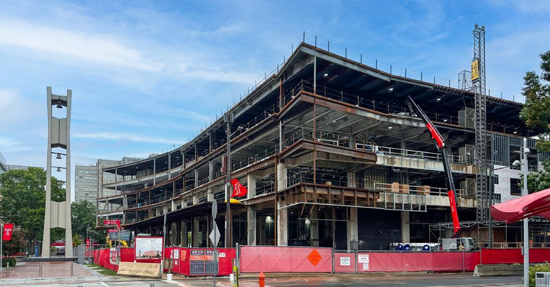 The construction of the Lincoln Financial Center, a twostory golf entertainment and practice center, introduced another layer of complexity with two distinct design teams—, one focused on the core and shell, and the other on the interior fit-out. Regular design charrettes and pull- planning sessions were instrumental in aligning efforts, resolving design conflicts, and maintaining project momentum. The Lincoln Financial Center’s expansive construction scope included excavation and grading, foundations, stormwater management, paving, sidewalks, landscaping, and site utilities. A defining feature of the work was the installation of a prefabricated pedestrian tunnel beneath Lansdowne Avenue, enhancing connectivity across the campus and linking key elements of the revitalized site.