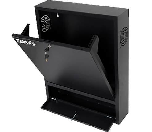 Armadietto in acciaio 19” a muro per DVR/NVR in impianti di sicurezza e video sorveglianza. Grazie alla robustezza dei materiali, alla serratura di sicurezza e alla predisposizione per l’installazione di un micro contatto magnetico, e allo speciale cassetto basculante, garantisce la massima sicurezza in un ingombro molto contenuto. Doppio alloggiamento per ventole da 120mm.