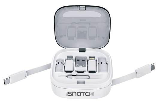 Multi USB Adapter Set: Comes with USB-C retractable data cable and USB/Micro/Lightning adapters, Card eject needle/card slot.