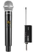 Sistema composto da microfono palmare wireless e ricevitore plug-in. Grazie al filtro anti-pop acustico integrato riduce/elimina la distorsione ed il rumore. Opera nella banda UHF, 10 canali (gestibili dal display). Può raggiungere una distanza di 50 metri. Il microfono portatile funziona con 2 batterie stilo da 1,5V (incluse), il ricevitore invece include una batteria ricaricabile 18650 Li-ion da 3.7V.