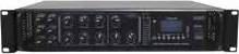 Amplificatore integrato di potenza. Terminali a vite per 6 zone con controlli separati. Lettore MP3, Radio FM e DAB+, BT, USB e SD card. 3 in MIC, 3 in Aux e 2 Line. 1 uscita Pre-amp, 1 gruppo IN-OUT. Controllo volume MASTER con toni ALTI e BASSI. VU meter a 5 segmenti (potenza, segnale, picco e fault). Uscita: 100V, 70V, 4~16 Ohm. Doppia alimentazione 230Vac / 24Vdc.