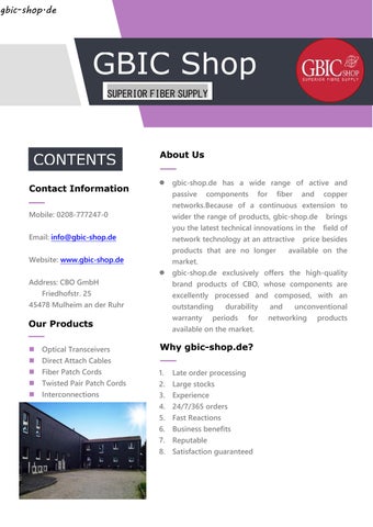 GBIC Shop is an online store for active and passive components used in network solutions. We exclusively offer high-quality brand products of CBO, whose components are excellently processed and composed, with an outstanding durability and unconventional warranty periods for networking products available on the market. - GBIC Shop has the world's largest range of optical transceivers. We provide various networking products for high-speed data transfers and sell only the highest quality products from the CBO. Our long warranty periods emphasize the quality and confidence in the products we distribute.