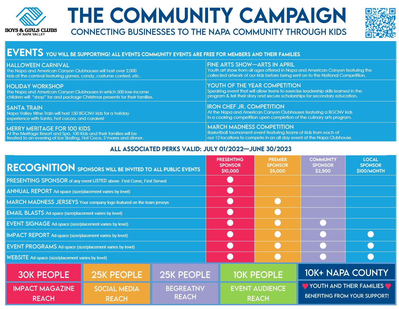 The Community Campaign allows local businesses to support and elevate specific community events offered by the Boys & Girls Clubs of Napa Valley. The events are exciting with offerings like a Santa Train experience, our Halloween Carnivals, and specialized program events like our Iron Chef Jr. and March Madness programs. You can review the full campaign by following the QR Code below.