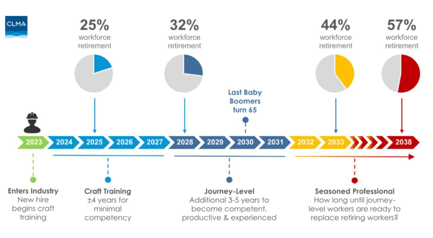 The first graph shows mega projects in the gulf coast projected through 2025. The second graph shows attrition versus the time horizon for someone to enter craft training to become a seasoned professional.