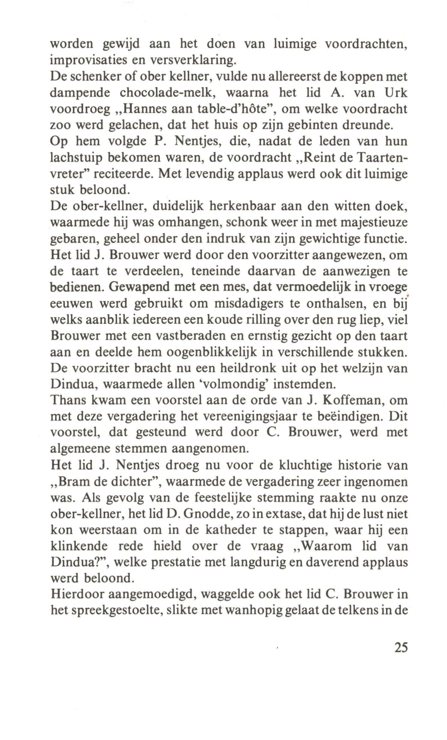 Het lid J. N entjes droeg nu voor de kluchtige historie van "Bram de dichter", waarmede de vergadering zeer ingenomen was. Als gevolg van de feestelijke stemming raakte nu onze ober-kellner, het lid D. Gnodde, zo in extase, dat hij de lust niet kon weerstaan om in de katheder te stappen, waar hij een klinkende rede hield over de vraag "Waarom lid van Dindua?", welke prestatie met langdurig en daverend applaus werd beloond.