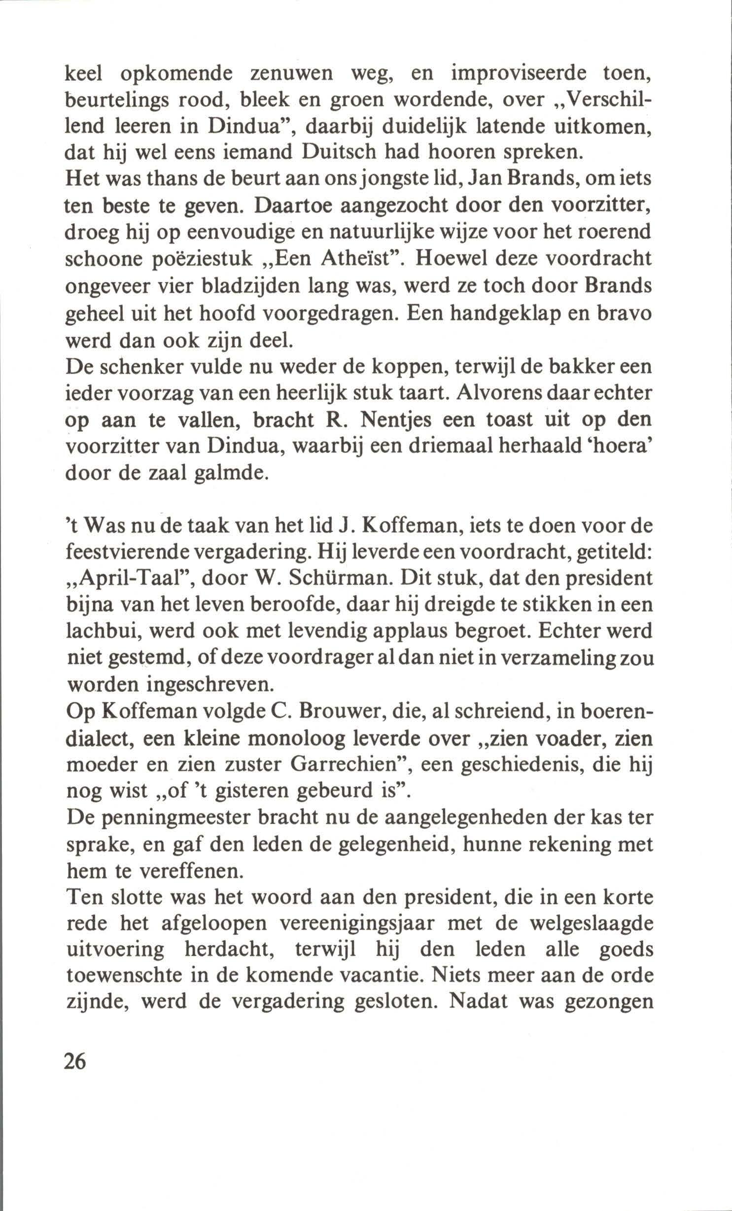 't Was nu de taak van het lid J. Koffeman, iets te doen voor de feestvierende vergadering. Hij leverde een voordracht, getiteld: "April-Taal", door W. Schürman. Dit stuk, dat den president bijna van het leven beroofde, daar hij dreigde te stikken in een lachbui, werd ook met levendig applaus begroet. Echter werd niet gestemd, of deze voordrager al dan niet in verzameling zou worden ingeschreven.