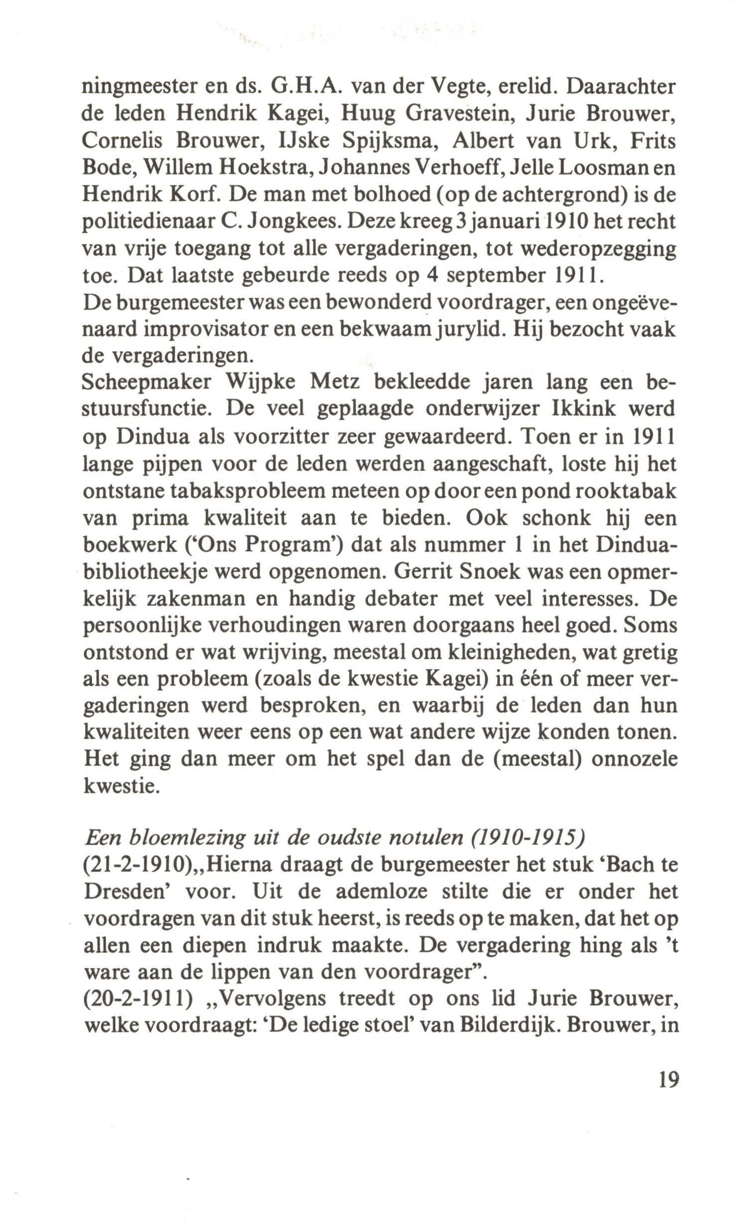 ningmeester en ds. G.H.A. van der Vegte, erelid. Daarachter de leden Hendrik Kagei, Huug Gravestein, Jurie Brouwer, Cornelis Brouwer, IJske Spijksma, Albert van Urk, Frits Bode, Willem Hoekstra, Johannes Verhoeff, Jelle Loosman en Hendrik Korf. De man met bolhoed ( op de achtergrond) is de politiedienaar C. J ongkees. Deze kreeg 3 januari 1910het recht van vrije toegang tot alle vergaderingen, tot wederopzegging toe. Dat laatste gebeurde reeds op 4 september 1911. De burgemeester was een bewonderd voordrager, een ongeëvenaard improvisator en een bekwaam jurylid. Hij bezocht vaak de vergaderingen.