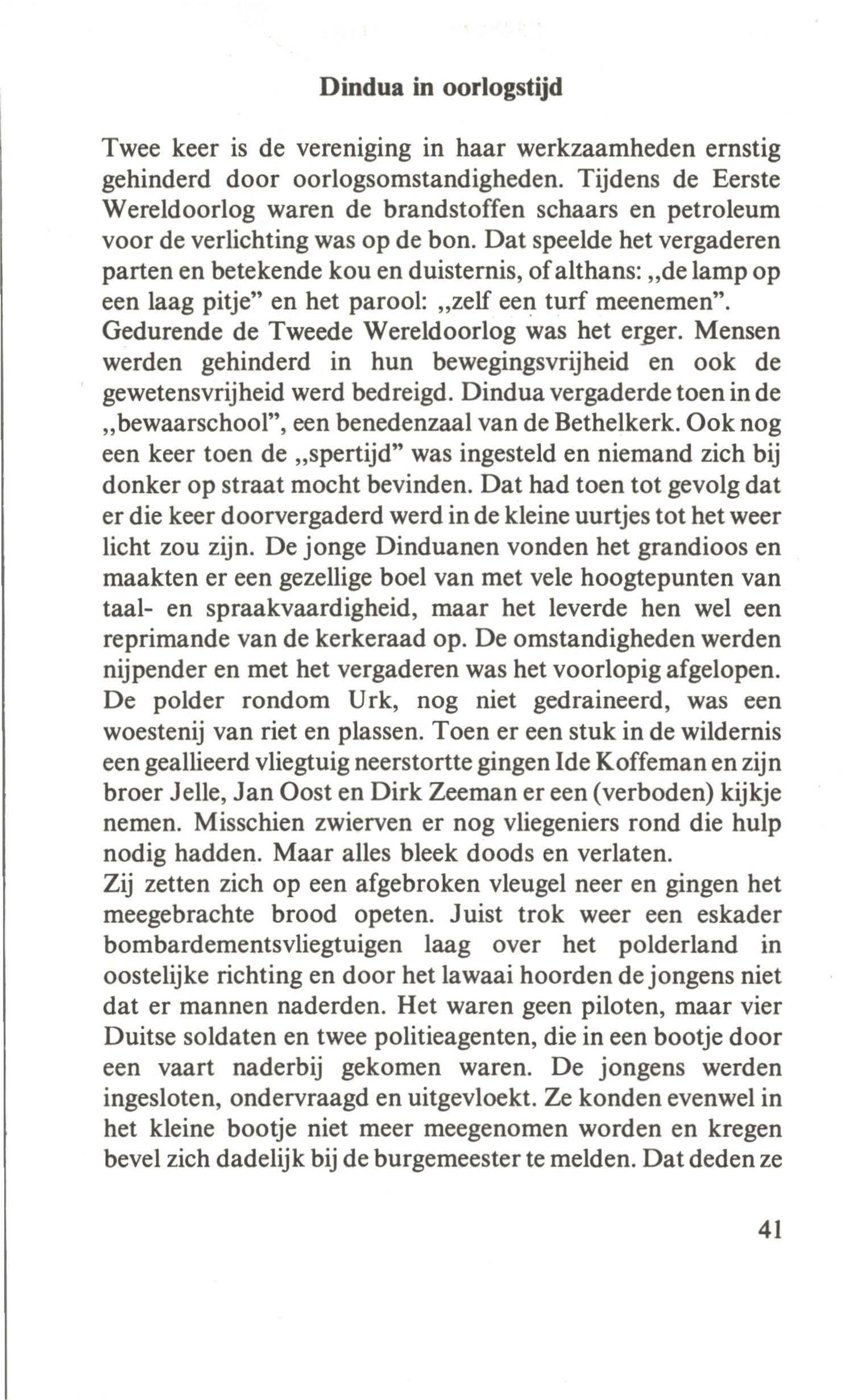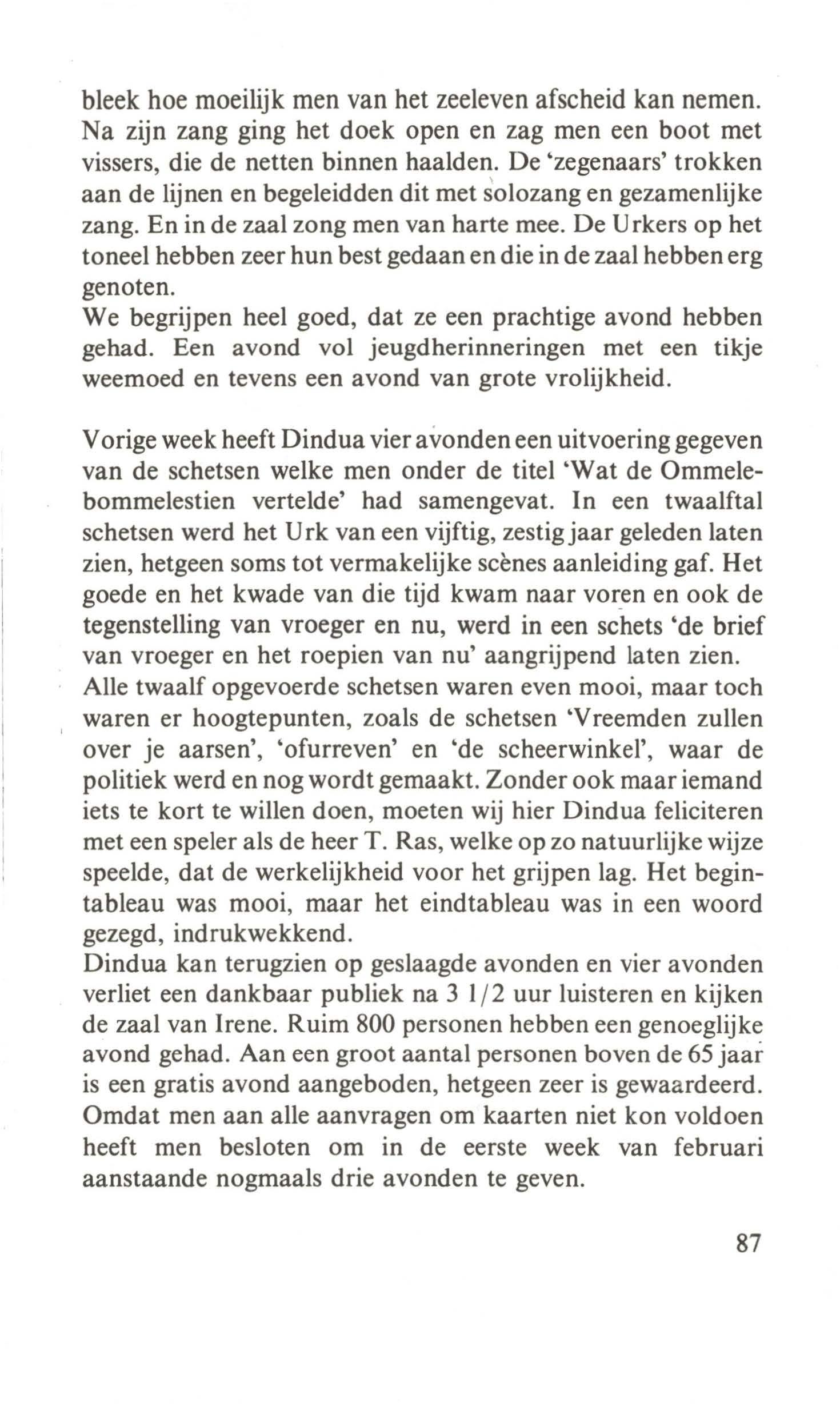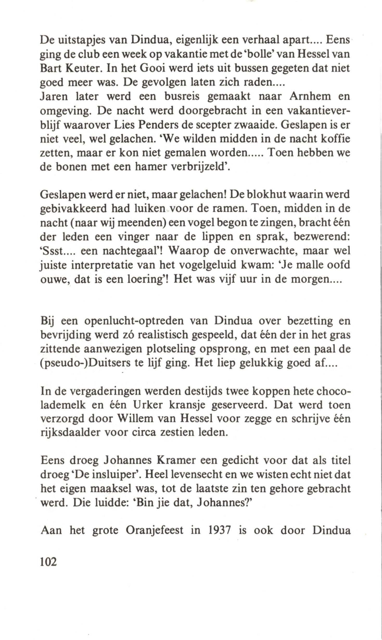 raakte ik er van overtuigd, dat ik mijn spreekvaardigheid voor bijna honderd procent te danken had aan Dindua. In mijn paperassen vond ik het toneelstuk 'Van Zuiderzee tot IJsselmeer' nog terug, dat ik met Jan ten Napel en de andere leden in elkaar heb gezet. De uitvoering werd een glorieus succes. Het stuk kwam vele malen op de planken. Jammer, dat het Dindua nu niet zo goed gaat. Ik hoop dat het gelukt de vereniging overeind te houden en nieuw leven in te blazen. Het zou zonde zijn dat een vereniging met zo'n prachtige geschiedenis te gronde zou gaan. Jonge U rkers, doe mee en breng Dindua weer op peil!