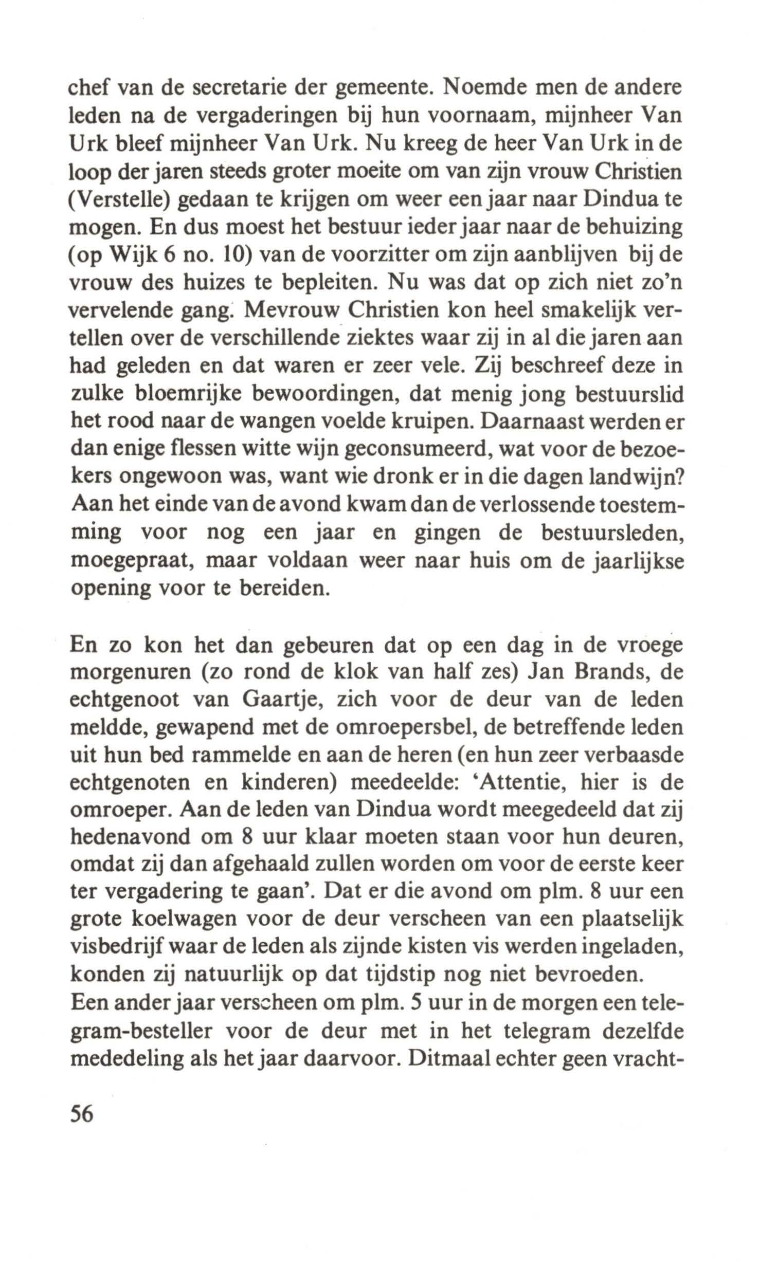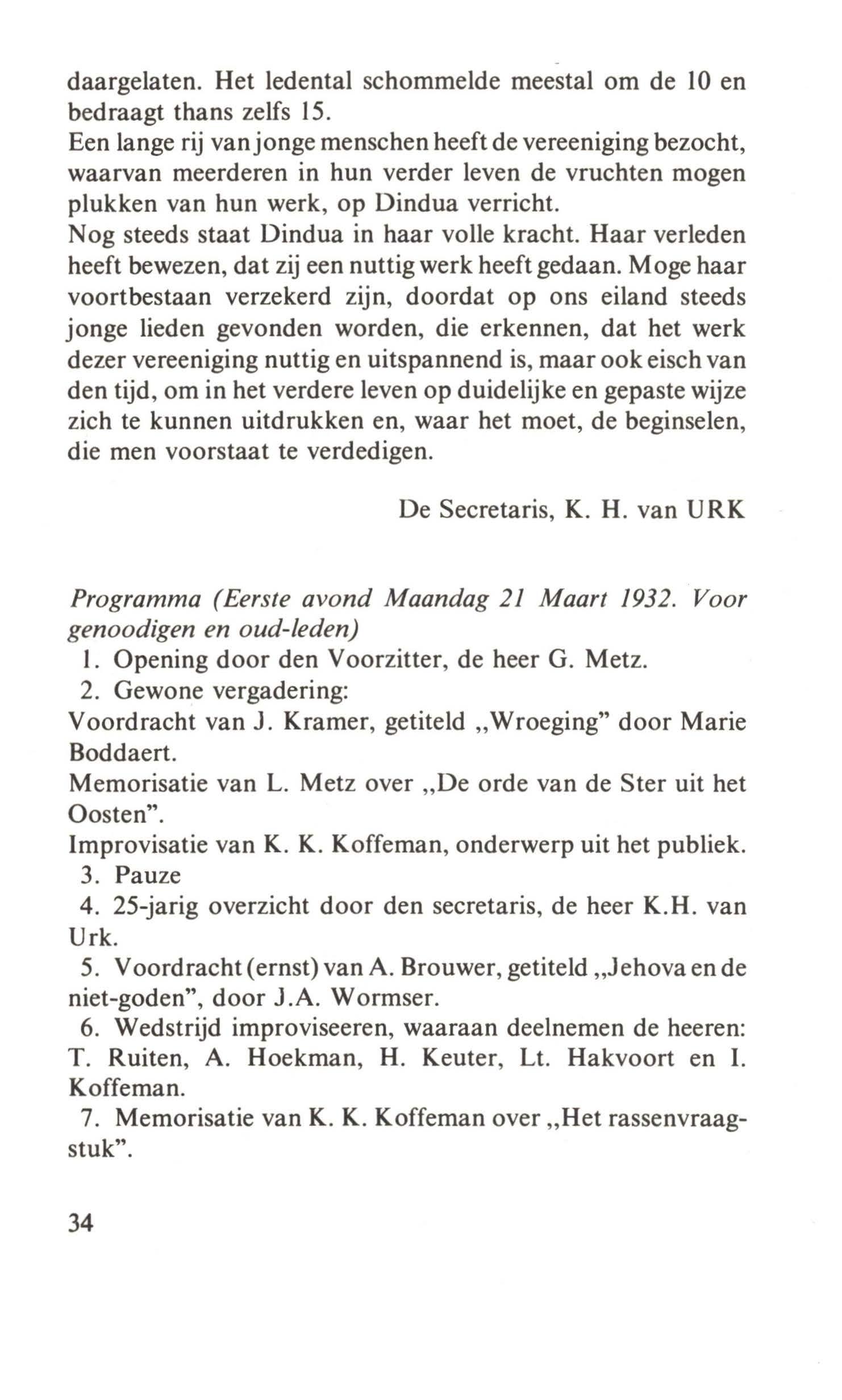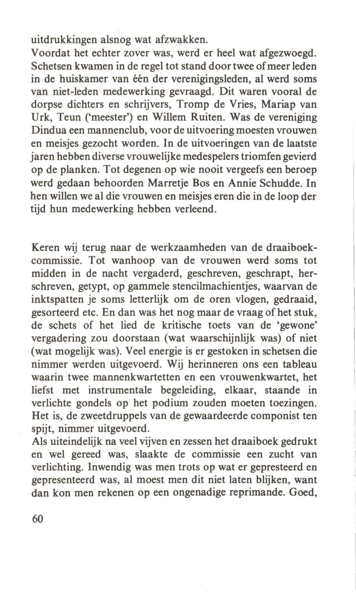 raakte ik er van overtuigd, dat ik mijn spreekvaardigheid voor bijna honderd procent te danken had aan Dindua. In mijn paperassen vond ik het toneelstuk 'Van Zuiderzee tot IJsselmeer' nog terug, dat ik met Jan ten Napel en de andere leden in elkaar heb gezet. De uitvoering werd een glorieus succes. Het stuk kwam vele malen op de planken. Jammer, dat het Dindua nu niet zo goed gaat. Ik hoop dat het gelukt de vereniging overeind te houden en nieuw leven in te blazen. Het zou zonde zijn dat een vereniging met zo'n prachtige geschiedenis te gronde zou gaan. Jonge U rkers, doe mee en breng Dindua weer op peil!