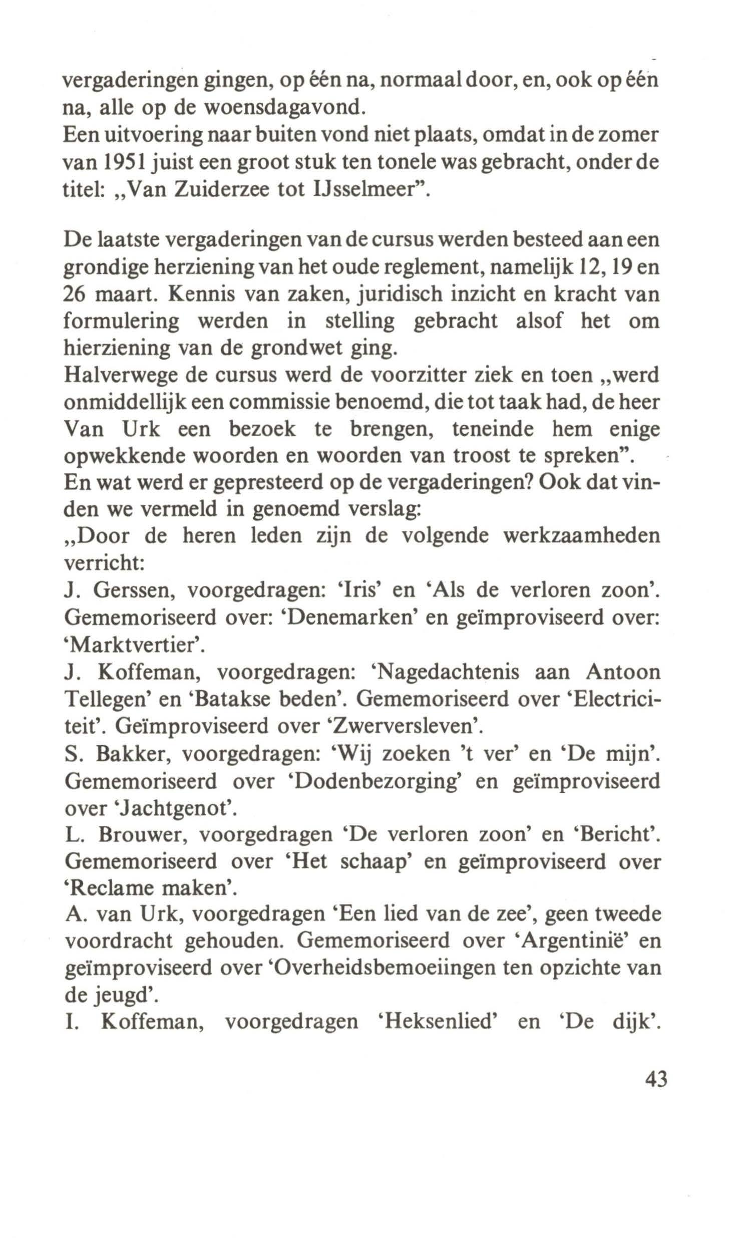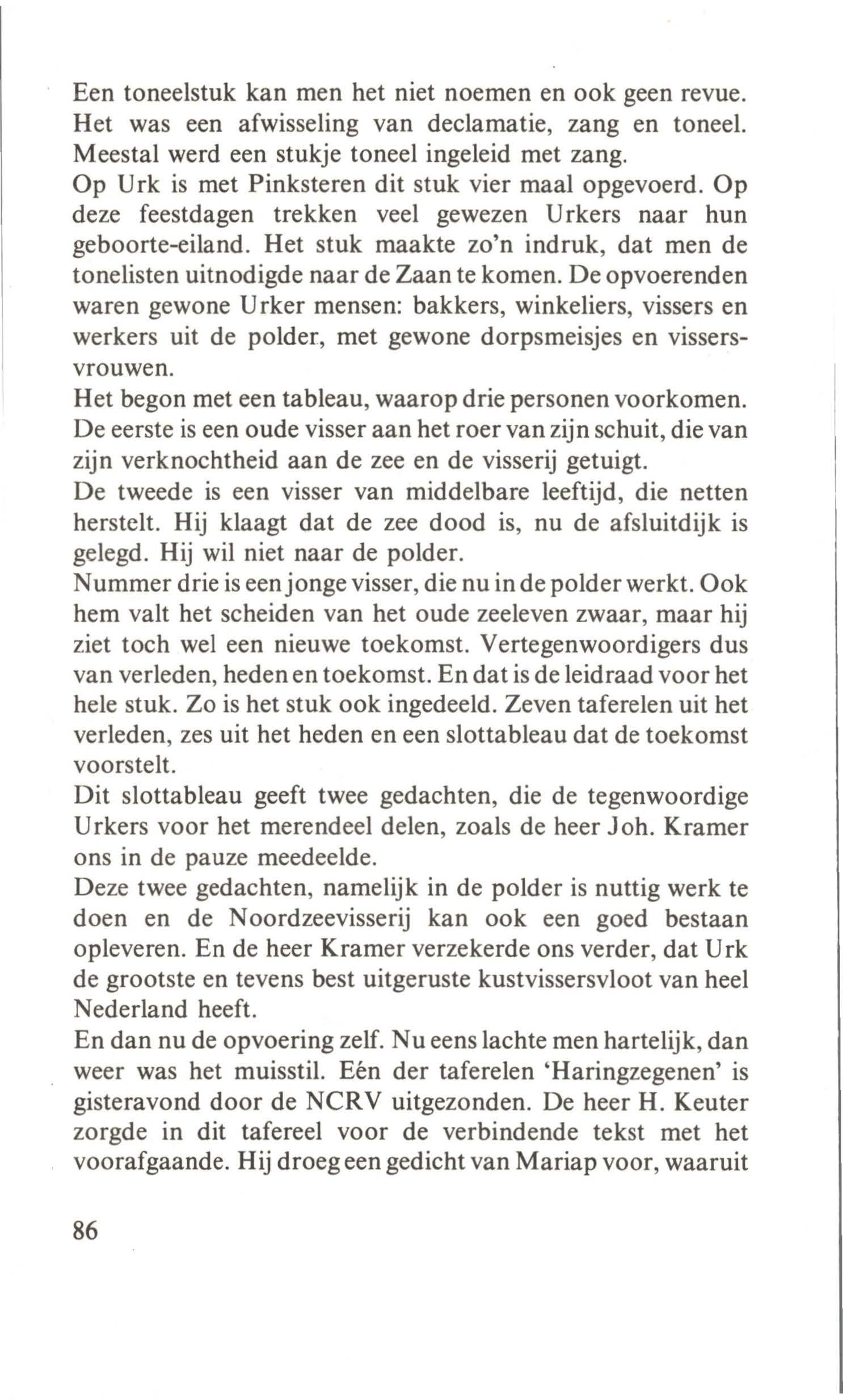 enthousiast meegewerkt. Van bevriende hand kregen we een verslag, waarvan we het volgende citeren: 'Omdat Urk geen grote zaal bezat, werd in 3 kleine gelegenheden feest gevierd. De spelers wisselden met hun stukken telkens van lokaliteit. De vereniging Dindua trad op met een samenspraak getiteld 'De levende modepop'. Vooral het komisch optreden van I.G. Koffeman en A. Brouwer veroorzaakte grote vreugde. De heer F. Bode jr. liet zich horen met een inleiding van Oranje en een voordracht over de tijd van Leidens ontzet! Een en ander werd af gewisseld door de zanggroep Post, die enige mooie liederen ten gehore bracht. R. Kramer, Mariap van Urk en I.G. Koffeman zongen een leutig, zelf gemaakt liedje, met een refrein dat luid door allen werd meegezongen. Nog richtte de pas op het eiland gekomen hervormde predikant ds. Van Wieringen, het woord tot de aanwezigen. Hij hoopte de genoeglijke kennismaking met de Urker bevolking met genoegen voort te zetten. In het jeugdgebouw had J. Nentjes de leiding, geassisteerd door R. Kale en P. Nentjes. Hier werd de avond op een verdienstelijke wijze verder gevuld door leden van de reciteervereniging TOP. De feestelijkheden duurden tot middernacht. Urk vierde, mede door het optreden van de reciteerclubs, een heel gezellig Oranjefeest' (K.W.).