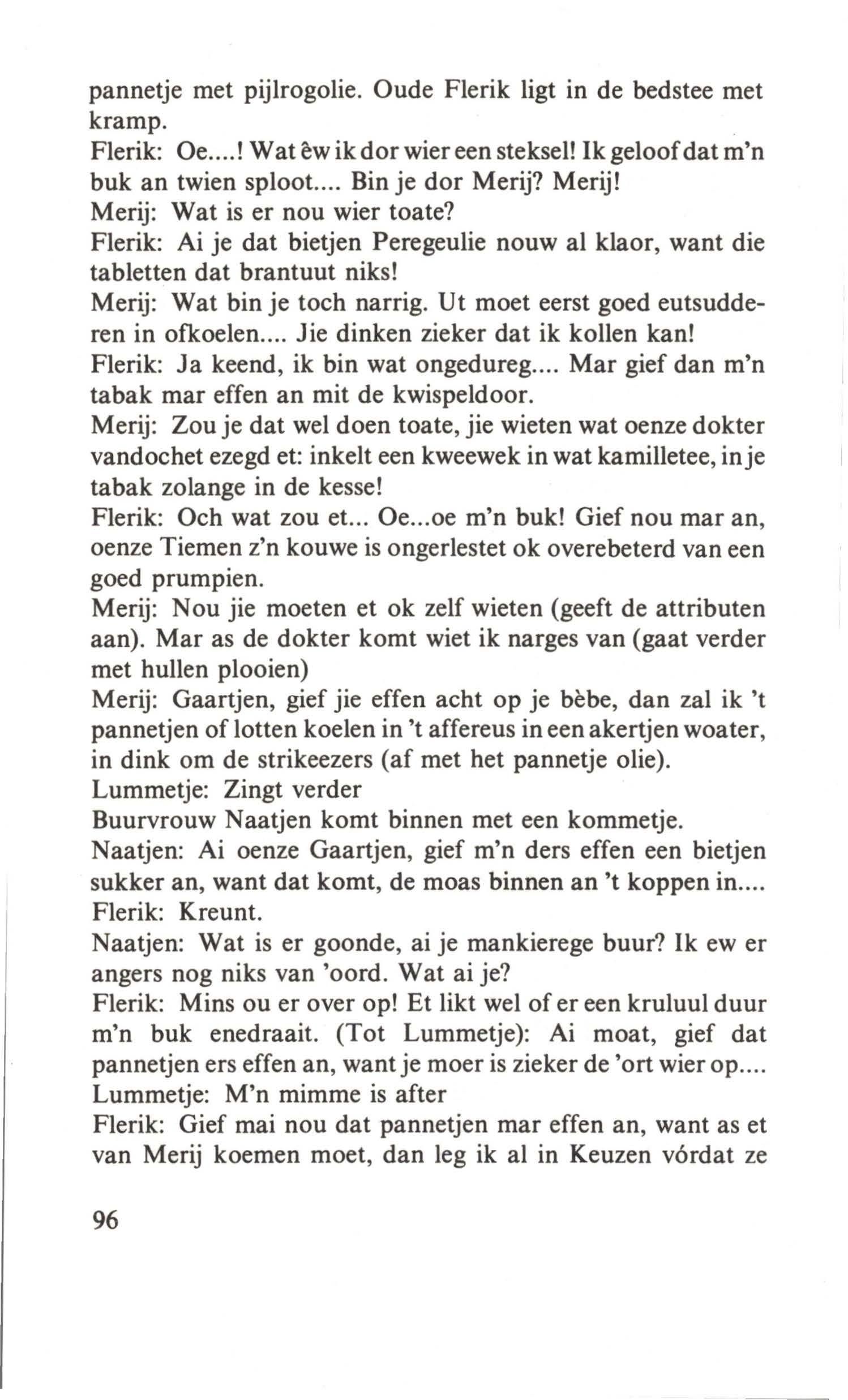 Flerik: Nee buie, zeg dat wel. Mar vandochet krieg ik zokke steeken in m'n buk, dat Merij èt er mi tien een dokter bai esliept in die zeen: Flerik jonge, zegt ie, as ik joe was zou ik m'n mar een poar dagen mak ouwen in mitien oalt ie een zak mit tabbeletten eut z'n booze. Mar jie wieten dat èt ok wênig om 't leef... ik êw ze mitien mar in de kwispeldoor emikt.