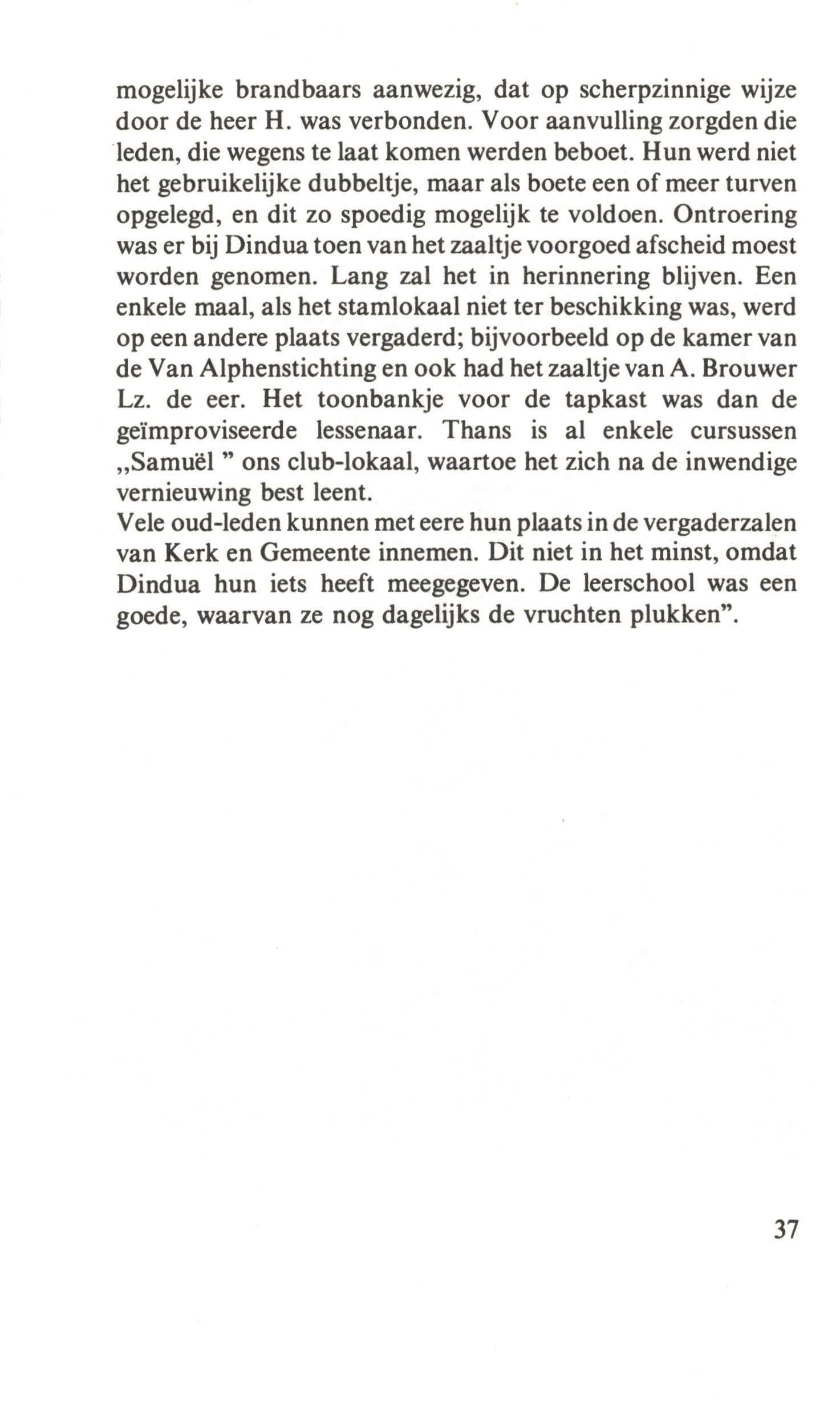 in het gebouw Samuel. Tot na de Tweede Wereldoorlog was er op Urk een permanent tekort aan geschikte vergaderruimte. In de notulen van 8 maart 1915 lezen we: ,,Na de pauze oefenden zich de oudere leden in een versverklaring. Daarbij leerden ze zich meteen wennen aan het wachten in de koude buiten, waaraan ze ongetwijfeld zouden worden blootgesteld op den uitvoeringsavond. Ter verklaring was het bekende versje 'Het Paard' van Huygens op de katheder gelegd. De meest typische verklaring werd hiervan gegeven door het lid D. Gnodde, die dit rijmpje in verband trachtte te brengen met spoortreinen, gepleisterde wegen, cokes en vele andere zaken meer". Ds. Van der Vegte was erevoorzitter tot zijn vertrek in 1915. De voorzitters kwamen meestal uit de school: zo zijn na J. Bernard en P.J. Ikkink ook G. Metz, R. Jansma en E. Koerselman voorzitter geweest. In een voorzitterloos tijdperk werd beurtelings door één der leden gepresideerd. De burgemeester kwam vaak op bezoek en steunde de vereniging met raad en daad. Hij prees Dindua 'en hare werkwijze als een goede tak van den boom der jongelingen'. Bij het 25-jarig bestaan van Dindua werd getuigd: ,,Vele oud-leden kunnen met ere hun plaats in de vergaderzalen van kerk en gemeente innemen. Dit niet in het minst omdat de vereniging hun iets heeft meegegeven. De leerschool was een goede, waarvan ze nog dagelijks de vruchten plukken. Alle typen en karakters hebben ze op Dindua gehad. Daarbij zelfs eigenaardige, bijvoorbeeld voorstanders van anti-militairisme en anti-vivisectie. Zeker is het, dat Dindua opvoedende waarde had en dienstig was voor de dagelijkse taak. Haar verleden heeft bewezen dat zij nuttig werk heeft gedaan".