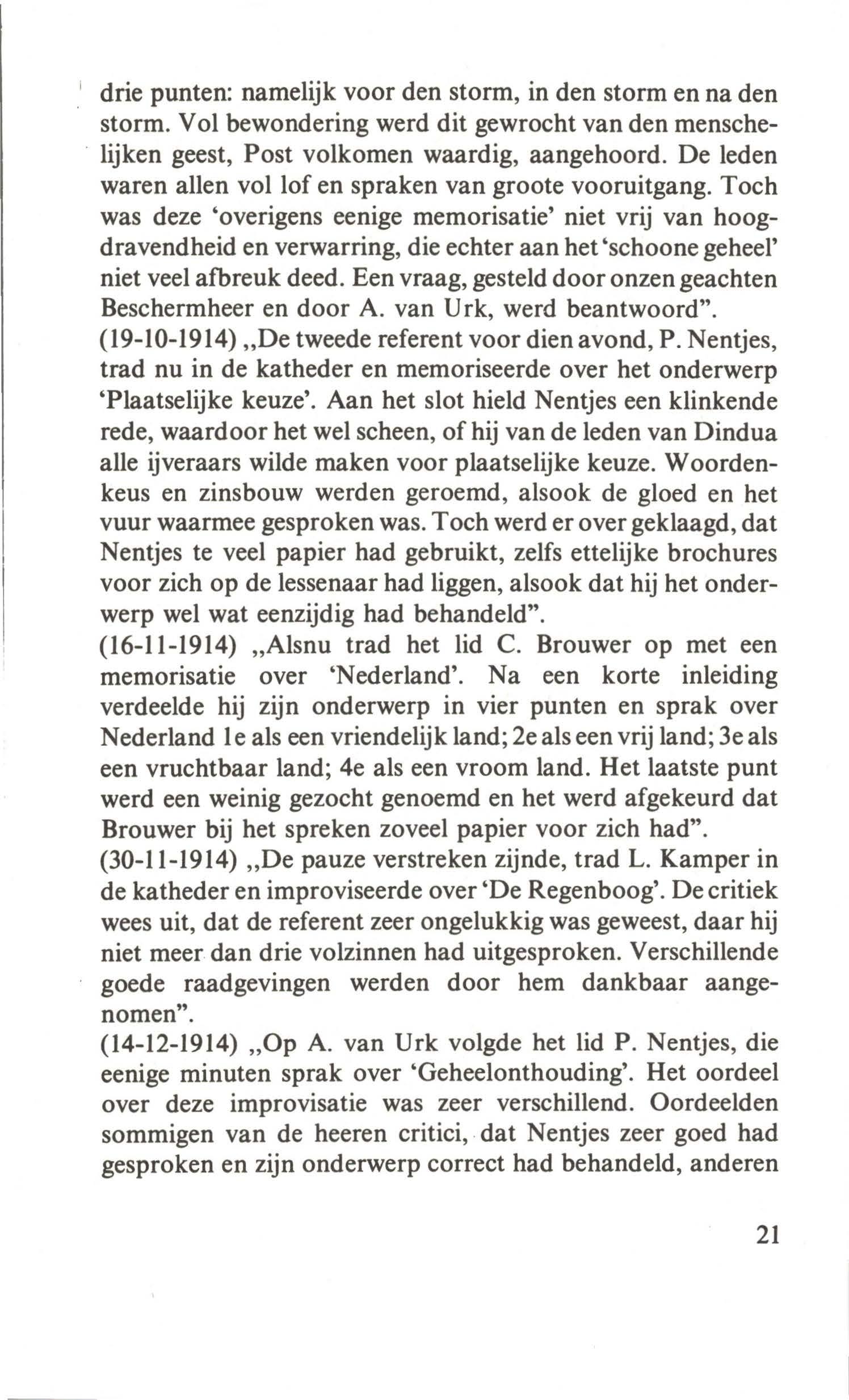 drie punten: namelijk voor den storm, in den storm en na den storm. Vol bewondering werd dit gewrocht van den mensche. lijken geest, Post volkomen waardig, aangehoord. De leden waren allen vol lof en spraken van groote vooruitgang. Toch was deze 'overigens eenige memorisatie' niet vrij van hoogdravendheid en verwarring, die echter aan het 'schoone geheel' niet veel afbreuk deed. Een vraag, gesteld door onzen geachten Beschermheer en door A. van Urk, werd beantwoord". (19-10-1914) ,,De tweede referent voor dien avond, P. Nentjes, trad nu in de katheder en memoriseerde over het onderwerp 'Plaatselijke keuze'. Aan het slot hield Nentjes een klinkende rede, waardoor het wel scheen, of hij van de leden van Dindua alle ijveraars wilde maken voor plaatselijke keuze. Woordenkeus en zinsbouw werden geroemd, alsook de gloed en het vuur waarmee gesproken was. Toch werd er over geklaagd, dat Nentjes te veel papier had gebruikt, zelfs ettelijke brochures voor zich op de lessenaar had liggen, alsook dat hij het onderwerp wel wat eenzijdig had behandeld". (16-11-1914) ,,Alsnu trad het lid C. Brouwer op met een memorisatie over 'Nederland'. Na een korte inleiding verdeelde hij zijn onderwerp in vier punten en sprak over Nederland 1e als een vriendelijk land; 2e als een vrij land; 3e als een vruchtbaar land; 4e als een vroom land. Het laatste punt werd een weinig gezocht genoemd en het werd afgekeurd dat Brouwer bij het spreken zoveel papier voor zich had". (30-11-1914) ,,De pauze verstreken zijnde, trad L. Kamper in de katheder en improviseerde over 'De Regenboog'. De critiek wees uit, dat de referent zeer ongelukkig was geweest, daar hij niet meer dan drie volzinnen had uitgesproken. Verschillende goede raadgevingen werden door hem dankbaar aangenomen". (14-12-1914) ,,Op A. van Urk volgde het lid P. Nentjes, die eenige minuten sprak over 'Geheelonthouding'. Het oordeel over deze improvisatie was zeer verschillend. Oordeelden sommigen van de heeren critici,. dat Nentjes zeer goed had gesproken en zijn onderwerp correct had behandeld, anderen
