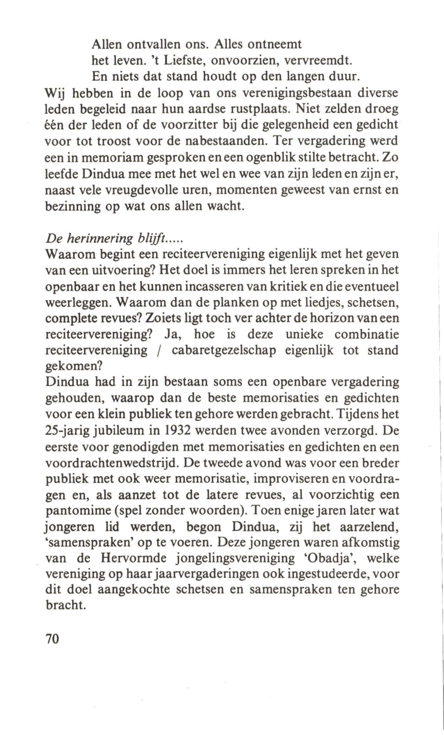 Het is bij het 75-jarig bestaan van Dindua verleden tijd. De vereniging (b)lijkt "oud en der dagen zat". Alleen de herinnering aan glansrijke tijden blijft (mede door dit boekje) nog bestaan.