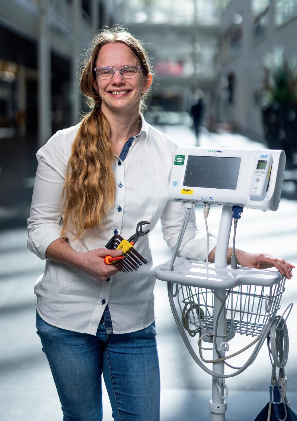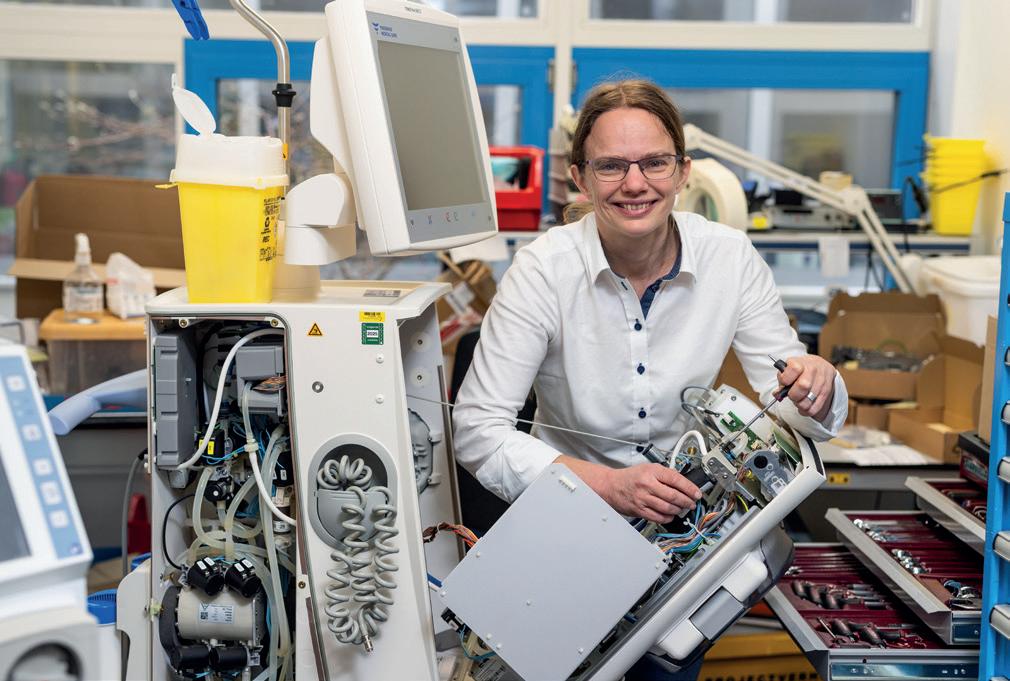 beademingsapparaten of pompen voor medicijnen. Een spuitpomp geeft bijvoorbeeld medicijnen in precies de juiste hoeveelheid. Als die te snel of te langzaam loopt, kan dat gevaarlijk zijn voor de patiënt. Wij controleren dat en repareren als iets stuk is.’