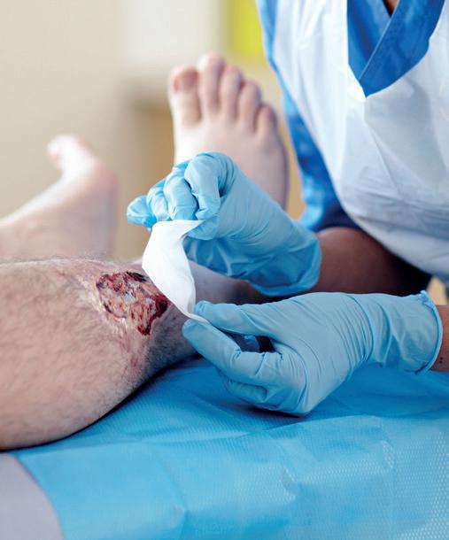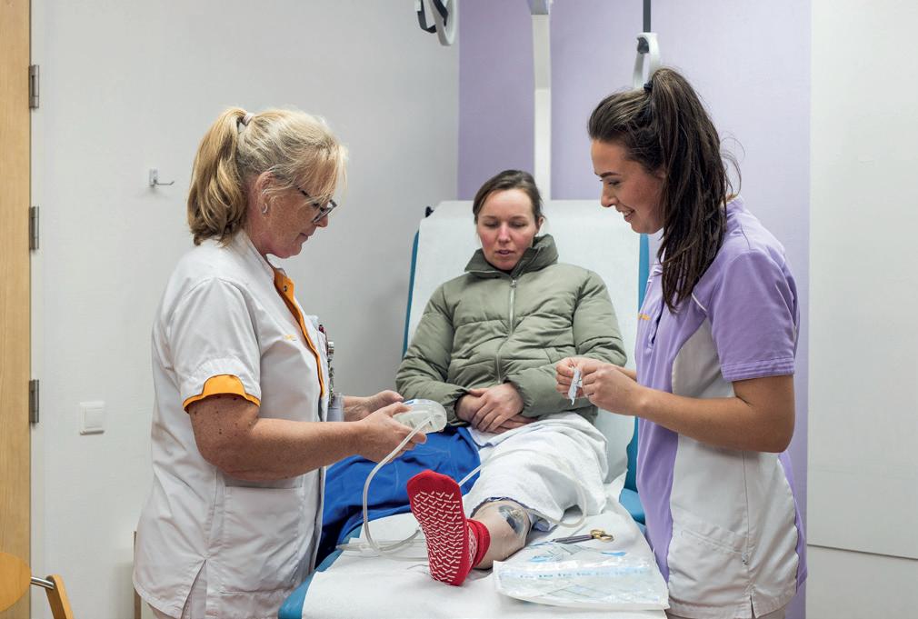 of met een vleesetende bacterie. Dat kan heel snel gaan, iemand kan binnen 24 uur overlijden! Bij elke wond kijken we wat nodig is. Soms gebruiken we speciale verbanden, soms een gel of een speciale pomp. Ook worden we in het hele ziekenhuis gevraagd om mee te kijken bij lastige wonden.’