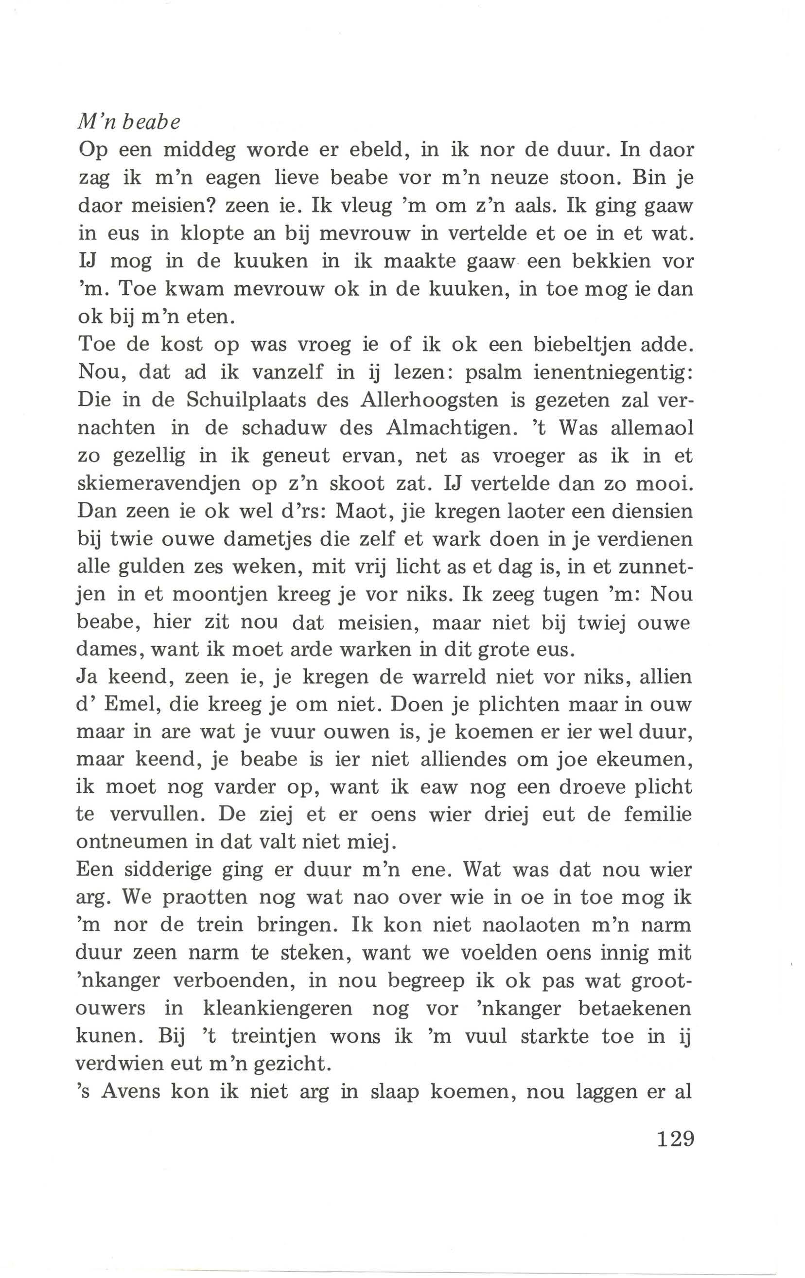 Toe de kost op was vroeg ie of ik ok een biebeltjen adde. Nou, dat ad ik vanzelf in ij lezen: psalm ienentniegentig: Die in de Schuilplaats des Allerhoogsten is gezeten zal vernachten in de schaduw des Almachtigen. 't Was allemaal zo gezellig in ik geneut ervan, net as vroeger as ik in et skiemeravendjen op z'n skoot zat. IJ vertelde dan zo mooi.