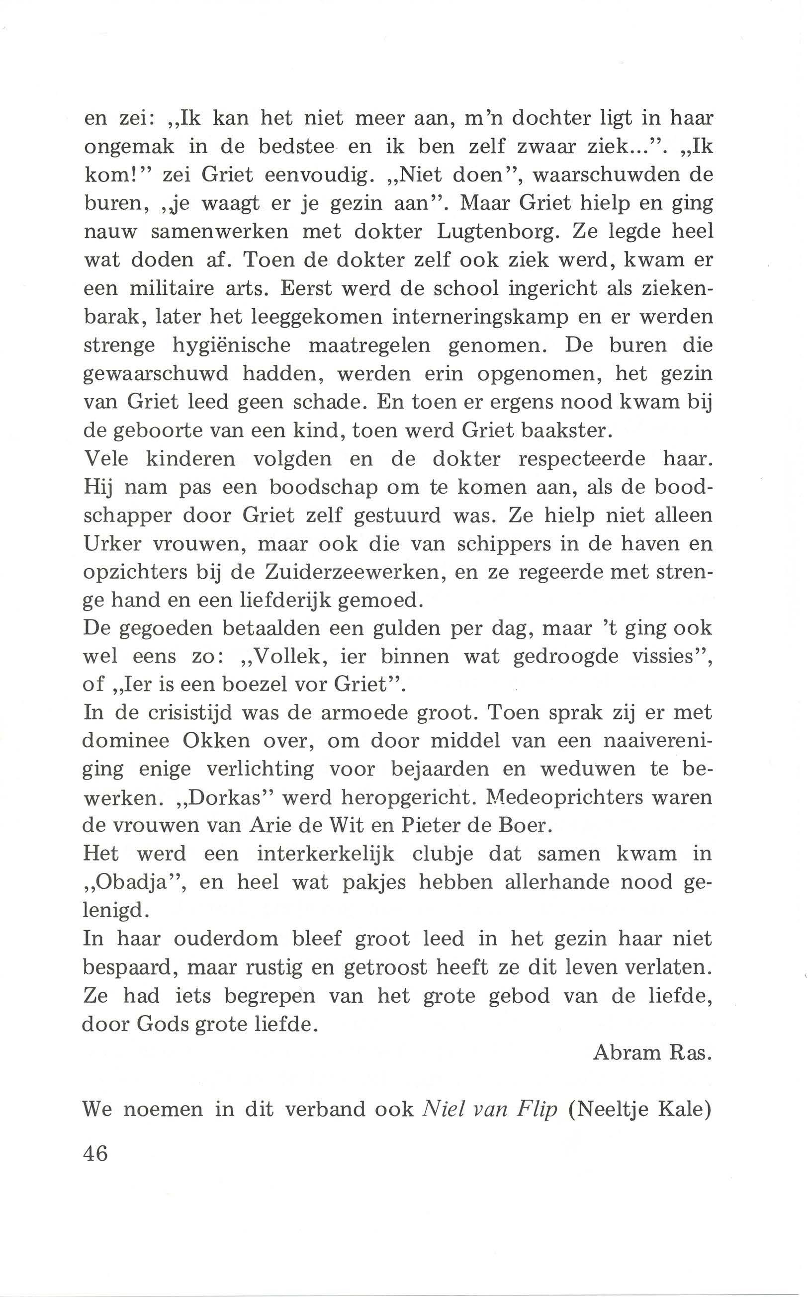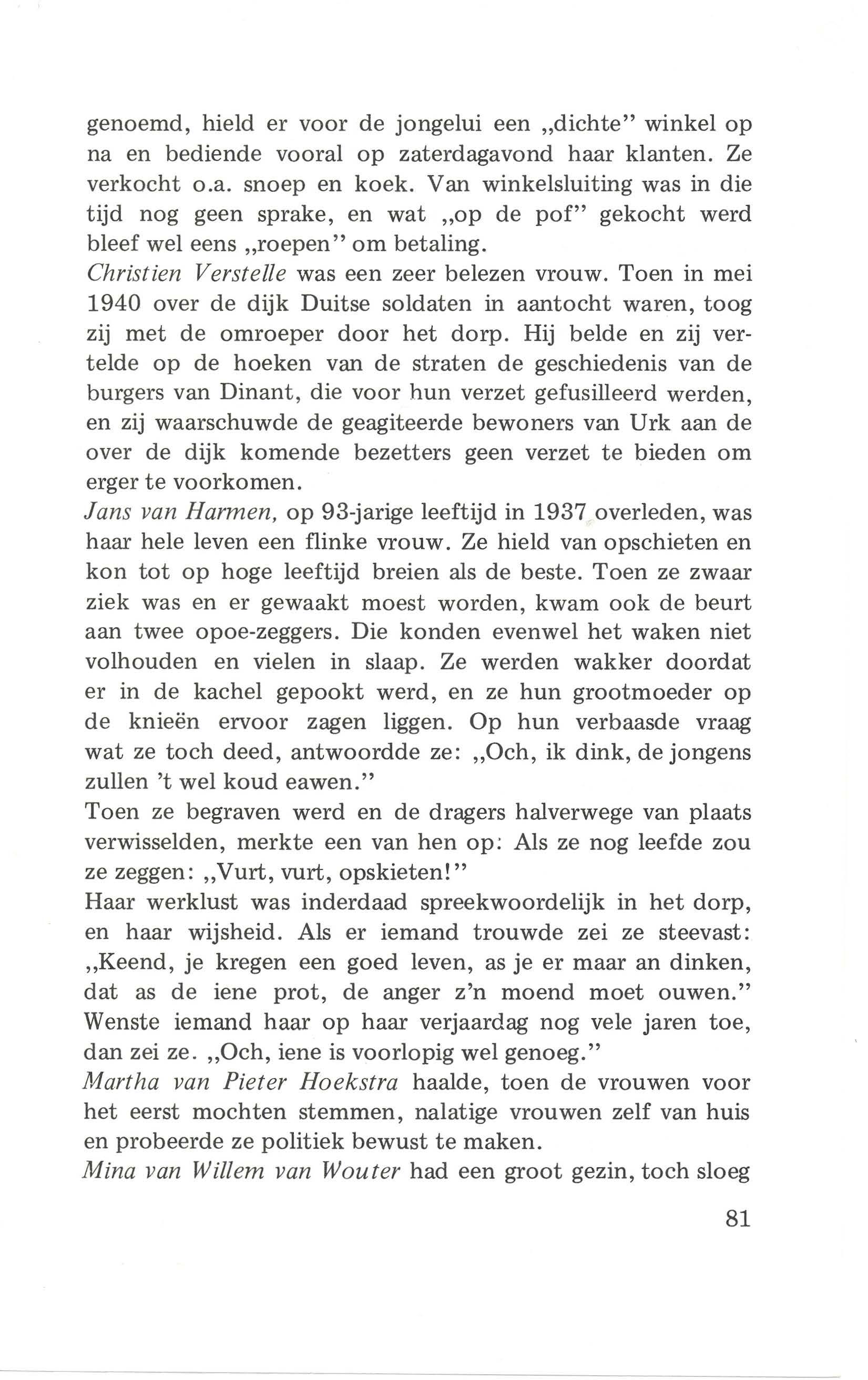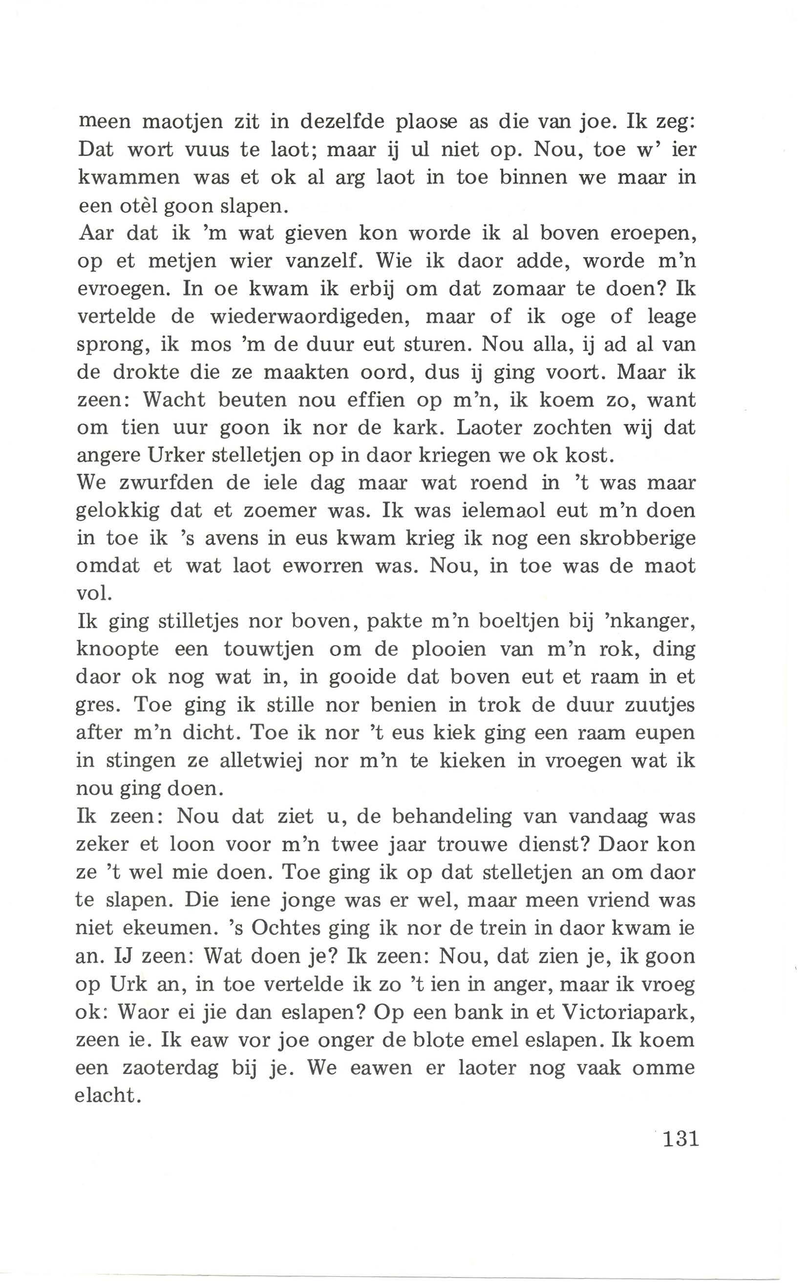 Op Urk was et ok zo mooi niet. 's Moondags krieg ik een briefien van m'n mimme waor in sting dat m'n ouwe bessien arg ziek was. Dat as ik 'r nog ers zien wou, dat ik dan overkoemen mos. Nou, ik vroeg een paor dagen vrij in ging op eus an, in ik krieg nog een keasien miej ok. In toe zag ik dan m'n bessien. Ik poeste d'r artelik, maar ik verskeut arg van d'r. Nee ouwe mins, docht ik, ier koem je niet maar duur ene. Elke dag kiek ik effies bij 'r in ze was blede as ze m'n zag. De leste dag was ik nog mit.'r alliendes. Ze zeen: Keend, wat bin ik blede dat je ekeumen binnen, want ik eaw nog wat tugen je te zeggen. 't Zal zo lange niet maar duren dan is je bessien ier niet maar, in nou moet je m'n beloven dat je een volwaardig mins vor kark in maoskappije zullen wezen.