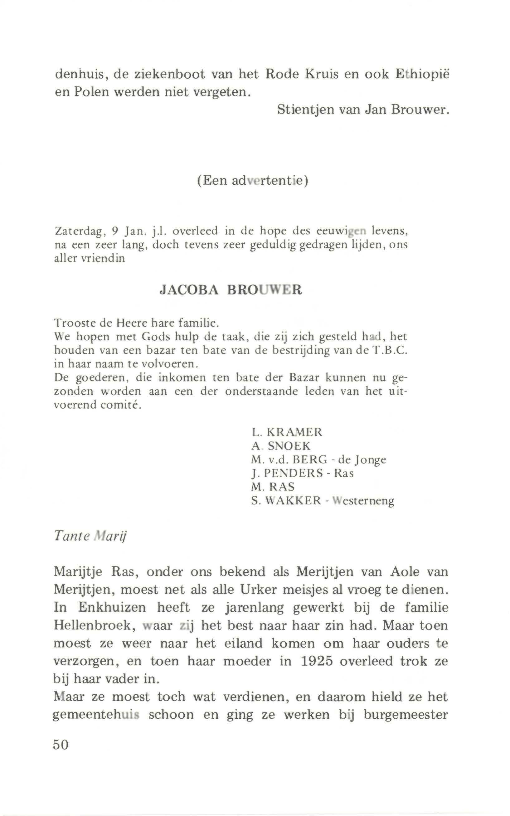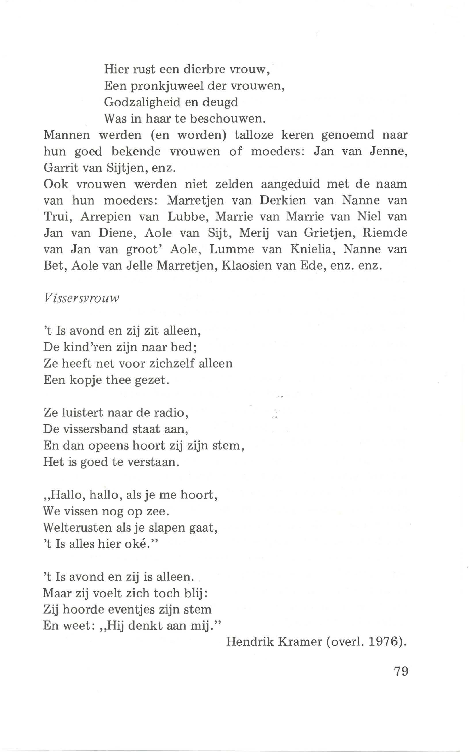 Niet minder bekend werden Jannetjen de baakster, Griet Sp "thorst, Janne t jen Anker, tante 1arij, Harmpje Bode, e.a. \\ at hebben die dames me e gewerkt aan de groei van de bevolk '· g : van ruim 150 in 1637 (na de pest) tot t e gen de elfduizend ':. 1982! Be droefde en beproefde vroU\\. en "D o· ve tijding vanuit zee" maak t e telkens weer bedroefde \ o u \'. e .: . . Als door de do ?n·:.ee , vergezeld van een ouderling, "tinge" werd gebracht, kwam er zware rou in de f milie om het verres van dierbaren.