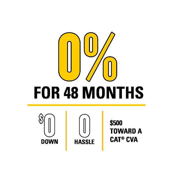 When it comes to saving on the Cat® compact equipment you need, we like to keep things simple. Get 0% for 48 months + $500 toward a Cat CVA (Customer Value Agreement)* on new Cat compact construction equipment.