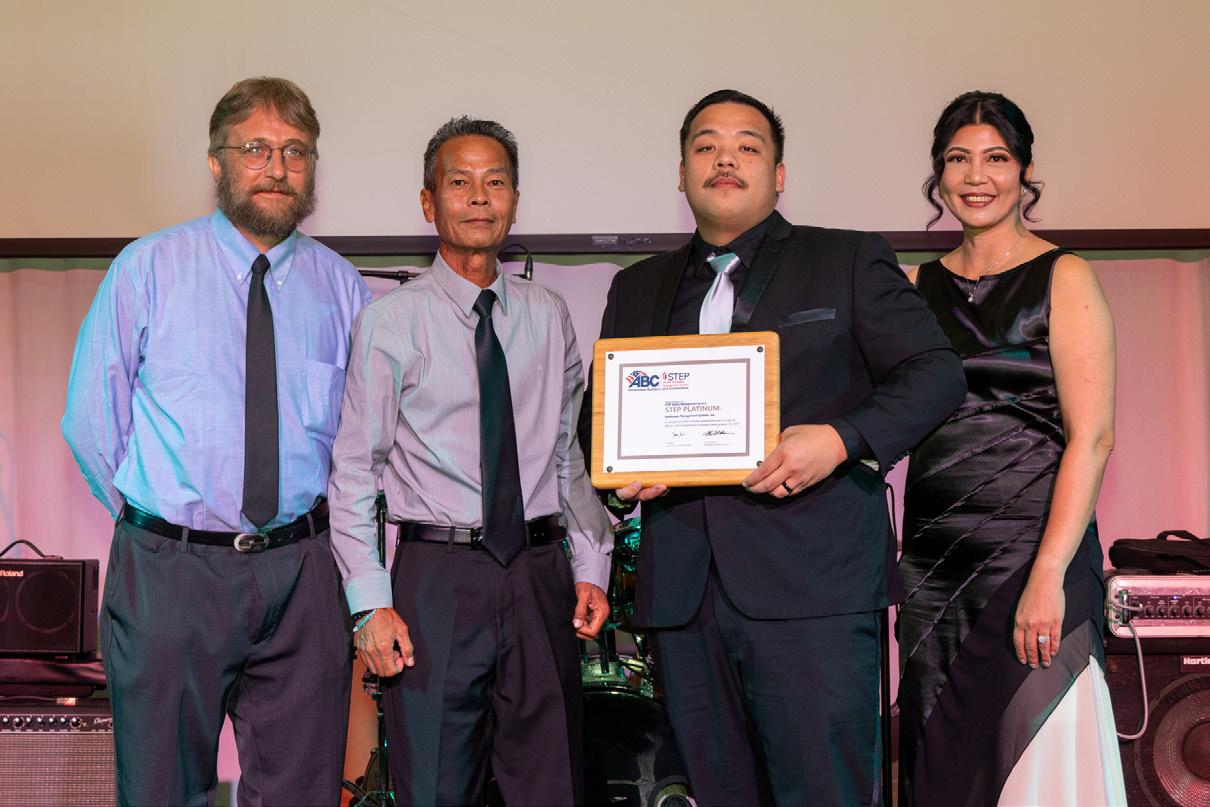 STEP award recipients demonstrated varying levels of safety excellence: Smithbridge Guam, Inc., achieved Bronze level; Polyphase System, Inc., earned Silver. Eight companies reached Platinum level: BME & Sons, Core Tech International, DZSP21, Landscape Management Systems, Pacific Federal Management, Proferre, and others.