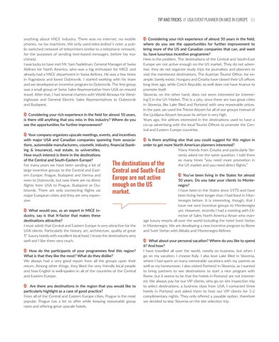 Q: Your company organizes upscale meetings, events, and incentives with major USA and Canadian companies spanning from associaQ: Is there anything else that you could suggest for this region in tions, automobile manufacturers, cosmetic industry, financial (bankorder to get more North American planners interested? ing & insurance), real estate, to universities. Many friends from Croatia and particularly SloHow much interest is there in the destinations venia asked me the same question. I told them of the Central and South-Eastern Europe? so many times “you need more promotion in The destinations of the For many years we have been sending a lot of the US market and you need direct flights.” large incentive groups to the Central and EastCentral and South-East ern Europe; Prague, Budapest and Vienna and Q: You’ve been living in the States for almost Europe are not active even to Dubrovnik, but now there are no direct 50 years. Do you take your clients to Monteflights from USA to Prague, Budapest or Dunegro? enough on the US brovnik. There are only connecting flights via I have been in the States since 1973 and have market. major European cities and they are very expenbeen living here longer than I had lived in Monsive. tenegro before. It is interesting, though, that I have not sent incentive groups to Montenegro yet. However, recently I had a meeting with DiQ: What would you, as an expert in MICE inrector of Sales North America Aman who mandustry, say is that X-factor that makes these age luxury resorts all over the world including the hotel Sveti Stefan destinations attractive? in Montenegro. We are developing a new incentive program to Rome I must admit that Central and Eastern Europe is very attractive for the and Sveti Stefan with Alitalia and Montenegro Airlines. USA clients. Particularly the history, art, architecture, quality of great 5* luxury hotels with excellent local food. I know the destinations very well and I like them very much. Q: What about your personal vacation? Where do you like to spend it? And how? I have travelled all over the world, mostly on business, but when I Q: How do the participants of your programmes find this region? go on my vacation, I choose Italy. I also love Lake Bled in Slovenia, What is that they like the most? What do they dislike? where I had spent so many memorable vacations with my parents as We always had a very good report from all the groups upon their well as my honeymoon. I also visited Portorož in Slovenia, as I wanted return. Among other things, they liked the very friendly local people to bring partners to see destinations to start a nice program with and how English is well-spoken in all of the countries of the Central Rome, but it seems to be that the hotels in Portorož are not interestand Eastern Europe. ed. We always pay for our VIP clients, who go on site inspection trip to select destinations, a business class from USA. I contacted three Q: Are there any destinations in the region that you would like to hotels in Portorož and asked them to host our VIP clients for 1-2 particularly highlight as a case of good practice? complimentary nights. They only offered a payable option, therefore From all of the Central and Eastern Europe cities, Prague is the most we decided to skip Slovenia on the site selection trip. popular. Prague has a lot to offer while keeping reasonable group rates and offering great upscale hotels.