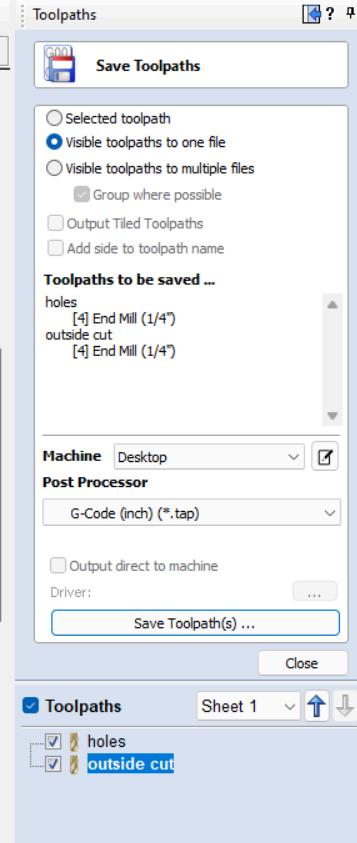 a. Ensure the list of selected toolpaths (check box) at the bottom is the order in which you want to cut (pockets first, inner cuts, then outer cuts last). You can drag and drop them where you want to place them.
