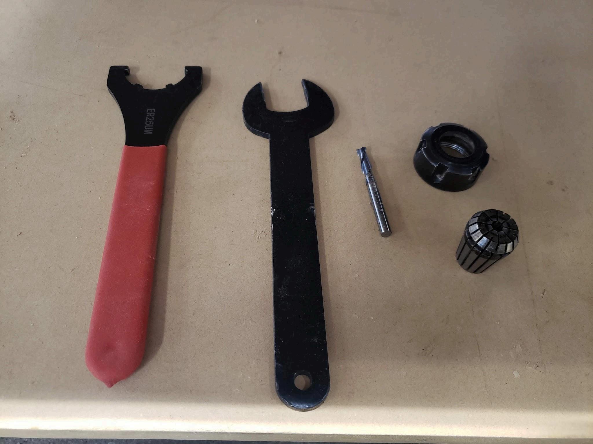 b. Locate spanner (black crescent wrench), collet wrench (red handle, notches in opening), collet, tooling, and collet nut