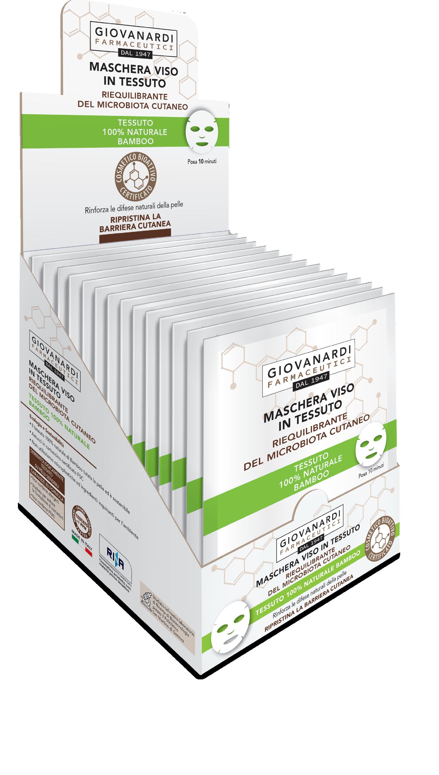 Maschera viso in tessuto di puro bamboo ad azione riequilibrante e dalla formulazione “Microbiota Friendly”, attivata da Biofermentati di Zenzero, Boswellia ed Uva, fitocomplessi derivanti da reazioni enzimatiche. Il particolare tessuto di bamboo, potenzia l’assorbimento cutaneo del complex di principi attivi, rendendo questa maschera il finishing perfetto per una beauty routine completa e bilanciata. Rinfresca piacevolmente la pelle del viso e ne tutela la funzione di barriera protettiva.