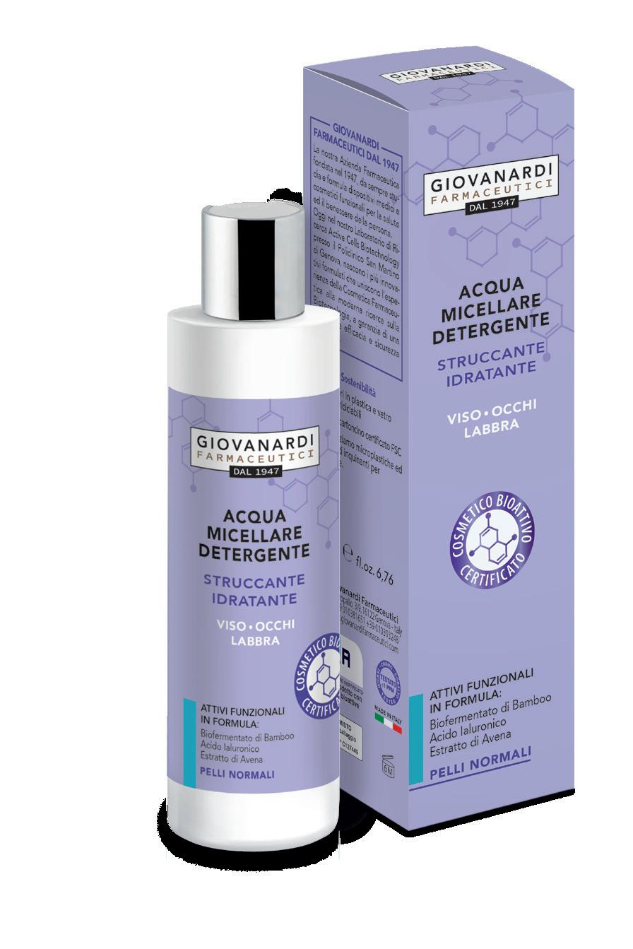 Studiata per la detersione e la rimozione del trucco da viso, occhi e labbra; sfrutta l’azione delle “micelle” rimuovendo le impurità senza necessità di un eccessivo sfregamento. La formula è arricchitata con Biofementato di Bamboo, altamente idratante e che svolge un’attività rivitalizzante del collagene e potenziata con Acido Ialuronico, ad alto effetto idratante, presente naturalmente nella nostra pelle ed Estratto di Avena, emolliente ricco in sali minerali e vitamine del gruppo B.
