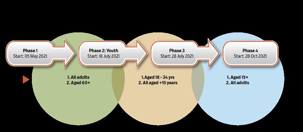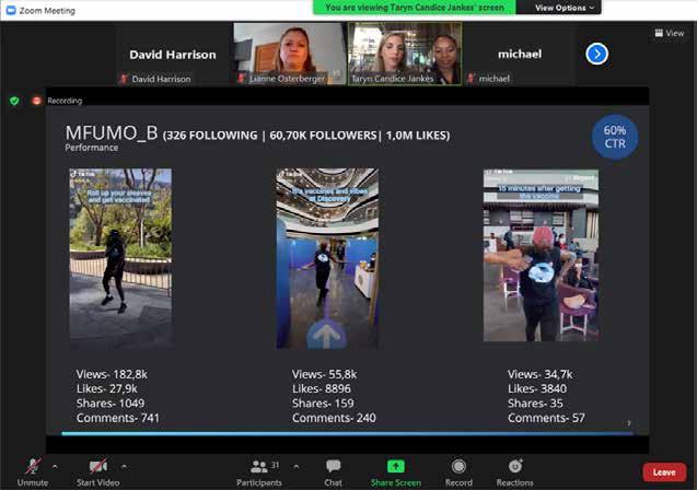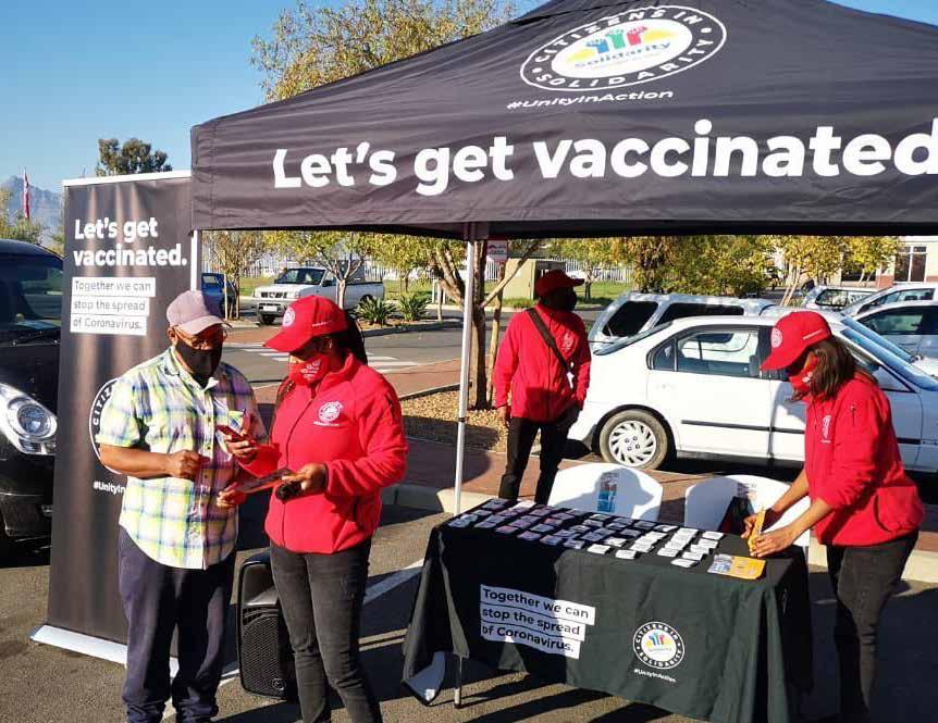 A total of 85 roadshows targeting high-traffic sites were undertaken across all provinces to encourage communi ties to take advantage of government’s vaccine roll-out programme. Local in fluencers were also engaged to educate communities on registration, benefits and potential side effects of the vaccines.