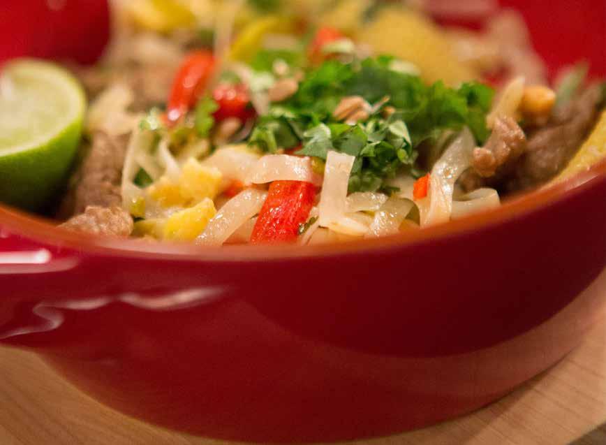 Ŋ Return the meat and onions to the vegetables in the frying pan and add the sauce. Cook whilst stirring for two minutes. Serve with rice noodles and sprinkle with the toasted sesame seeds and some herbs.