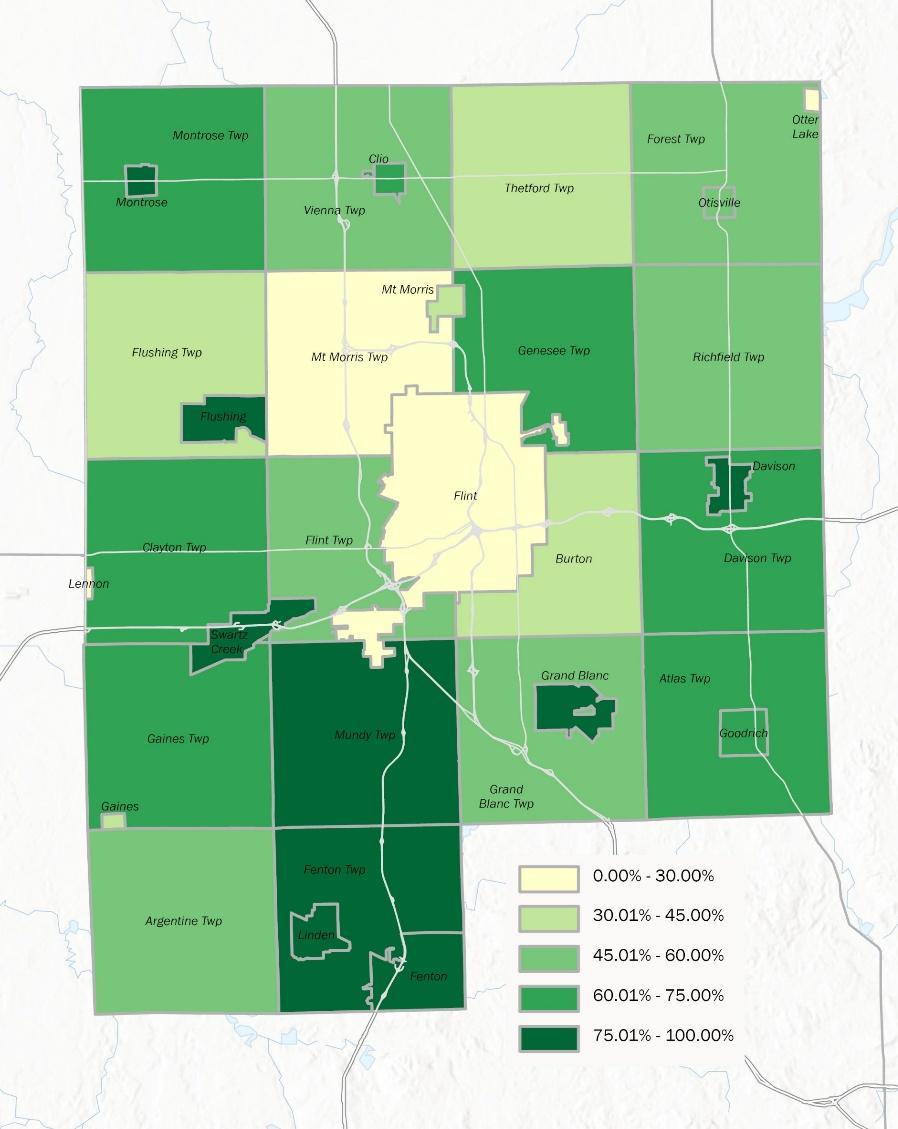 A significant portion of Genesee County residents face challenges in affording necessities, with over 45% of residents struggling to meet essential needs (Figure 3-2). In 2023, the median income in Genesee County was $60,027 (2023 ACS). A family of 4, including 2 children, is living in poverty if their annual income is $30,000 or less (2023 MI ALICE Report). Currently, 17% of households in Genesee County live at or below the poverty line - higher than both the Michigan rate of 14% and the U.S. rate of 11% (2023 MI ALICE Report). However, poverty statistics alone do not fully capture financial hardship. United Way, a nonprofit organization focused on covering basic needs for individuals and families, develops an annual ALICE (Asset Limited, Income Constrained, Employed) report for the Genesee County area. ALICE considers households that earn above the poverty threshold but still struggle to afford basic needs. Approximately 28% of households in the County are considered ALICE. Housing affordability is a major contributor to challenges with cost of living. Notably, 69% of renters are spending 30% or more of their income on housing (2023 MI ALICE Report). While a variety of housing options exist across income levels, many families still struggle with housing cost burdens. Daily, there are an estimated 576 people that are homeless or require some type of housing services within the County (Flint/Genesee Continuum of Care), showing a greater need for affordable living and transitional housing.