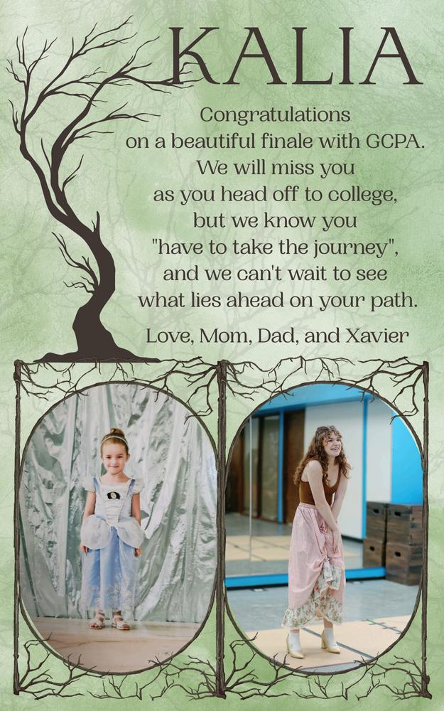 Kalia Pagano (Cinderella), is a recent high school graduate and will be attending Millikin University in the fall for her BFA in Musical Theatre This is her 23rd show with GCPA! GCPA favorites include Alice by Heart (Alice), The Prom (Angie), Ragtime (Evelyn), School of Rock (Patty), 13 (Patrice), 9 to 5 (Ensemble, u/s Violet), Something Rotten (Chef / Ensemble), and Titanic Outside of GCPA some of her favorite roles have been Small Allison in Take Two Production's Fun Home, Young Cosette in Les Misérables at Chaminade, and Young Julia in St Louis University Theatre's production of James Joyce's The Dead At The Muny she has performed in Beauty & the Beast, Chess and Joseph Dreamcoat She has been taking dance and musical theatre classes since she was 4 and has been singing since before she could speak She would like to thank GCPA and all of her amazing instructors over the years - she wouldn’t be where she is without them. So much love to Mom, Dad & Xavier!