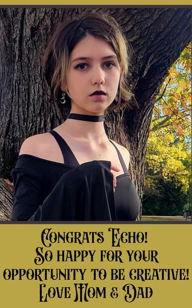 Echo Pentz (Costume Assistant) (they/them) is a rising high school sophomore and is excited to be a part of the Into the Woods creative team! This is Echo's third experience as a Costume Assistant and their tenth as part of the stage crew They have been working with GCPA since 2017 and are thrilled to help create tons of unique fantasy pieces ready to be lost in the Woods. Echo wishes everyone fun, the best of luck, and an enjoyable show!