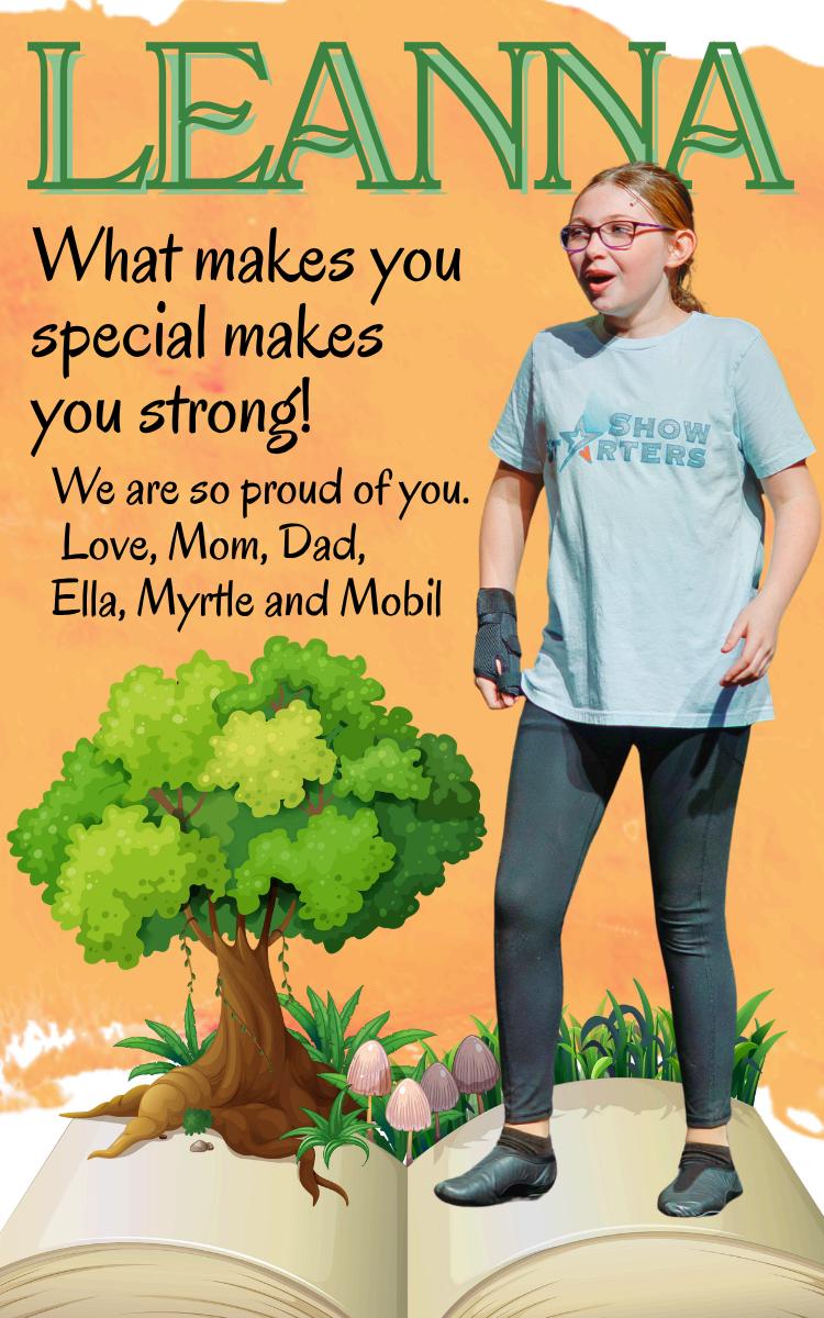 Leanna Myers (Ensemble, u/s Young Fiona), a 7th grader, is excited to return to the GCPA stage! She is a member of GCPA's Show Starters Recent credits include Finding Nemo Kids (Sheldon/Turtle Kid) and Oliver! (Fagin's Gang) with GCPA; The Little Mermaid, Jr (Flotsam) with Stray Dog Theatre; and The Enchanted Bookshop (Fagin / Dolittle / Frankenstein) with Alfresco Productions She studies in the Bailey Voice Studio. Leanna enjoys making YouTube videos and taking care of her cat, Mobil. Love to her Mom, Dad, Ella, Mobil and her friends.