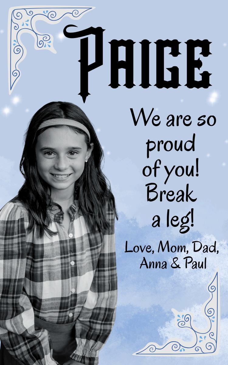 Paige Passanise (Baby Bear) is a rising 7th grader and so excited to work with the cast and crew of Shrek Jr.! This will be her fifth show She’s previously been in The Music Man, Mean Girls Jr., The Little Mermaid Jr., and Bye Bye Birdie When not acting, Paige enjoys dance classes, voice lessons, guitar lessons and spending time with her family and friends She thanks her voice instructor, Ashley, and her family and friends for all of their support!