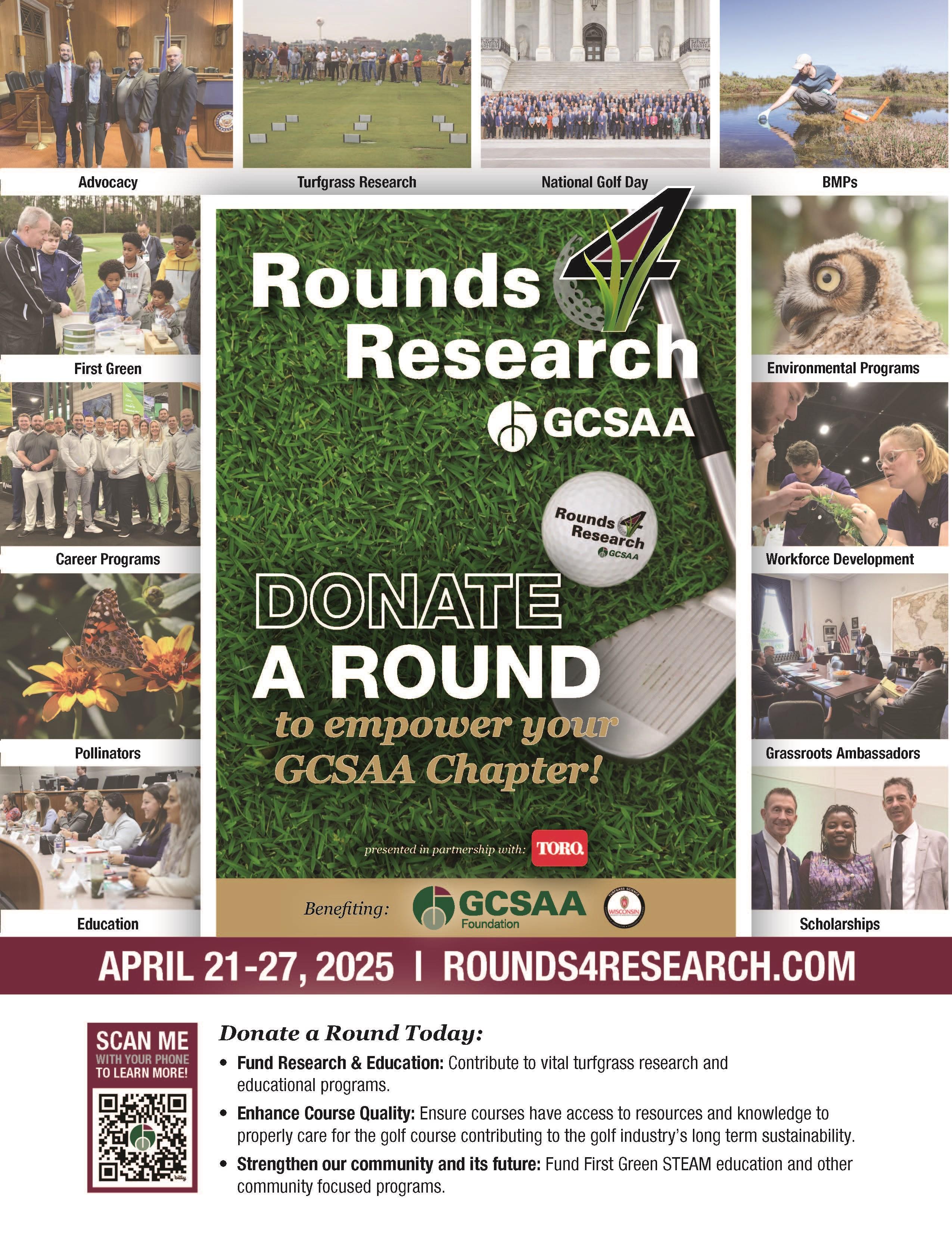 The 2025 Rounds 4 Research auction is scheduled for April 2127. Rounds 4 Research allows GCSAA chapters to participate as fundraising partners with eighty percent of the auction proceeds going back to those chapters who secured the donations. Chapter boards can then determine how to use those funds for turfgrass research, government advocacy or chapter education. The program was started in 2012 to address shortages in the above areas and has raised more than $4 million since its inception. The premise of the program is simple: Golf facilities can support the effort by donating rounds of golf for two or four or “stay and play” packages and other items that will be auctioned online through a nationwide auction from April 2127, 2025. The auction is conducted through the bidding platform https://www.biddingforgood.com/auction/auctionhome.action?auctionId=3417 31688.