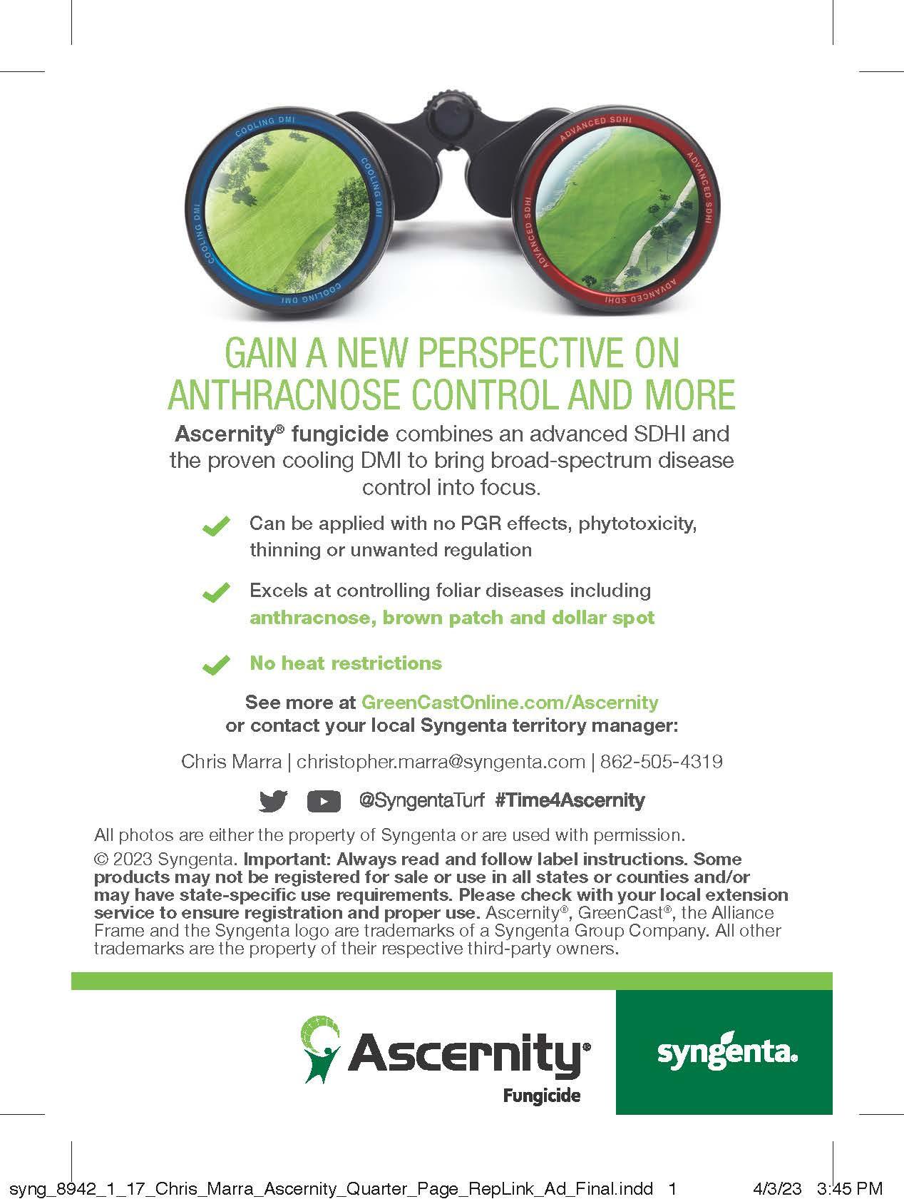 With the last weeks of Spring upon us, the days getting longer, Summer arriving, and course activity kicking into high gear, I would like to open this issue of The Greenerside wishing the best to our members for the Summer of 2023. I would especially like to commend the efforts of four superintendents who are hosting LPGA events this year in New Jersey; Mike Brunelle at Upper Montclair Country Club hosted the LPGA Founders Cup, Greg James hosted the Mizuho Americas Open at Liberty National, Mike Bair hosting the Shoprite LPGA Classic at Seaview Golf Club, and Greg Boring at Baltusrol Golf Club hosting the KPMG Women's PGA Championship The association is proud of the hard work of these clubs and their staff to showcase New Jersey golf at the highest professional level
