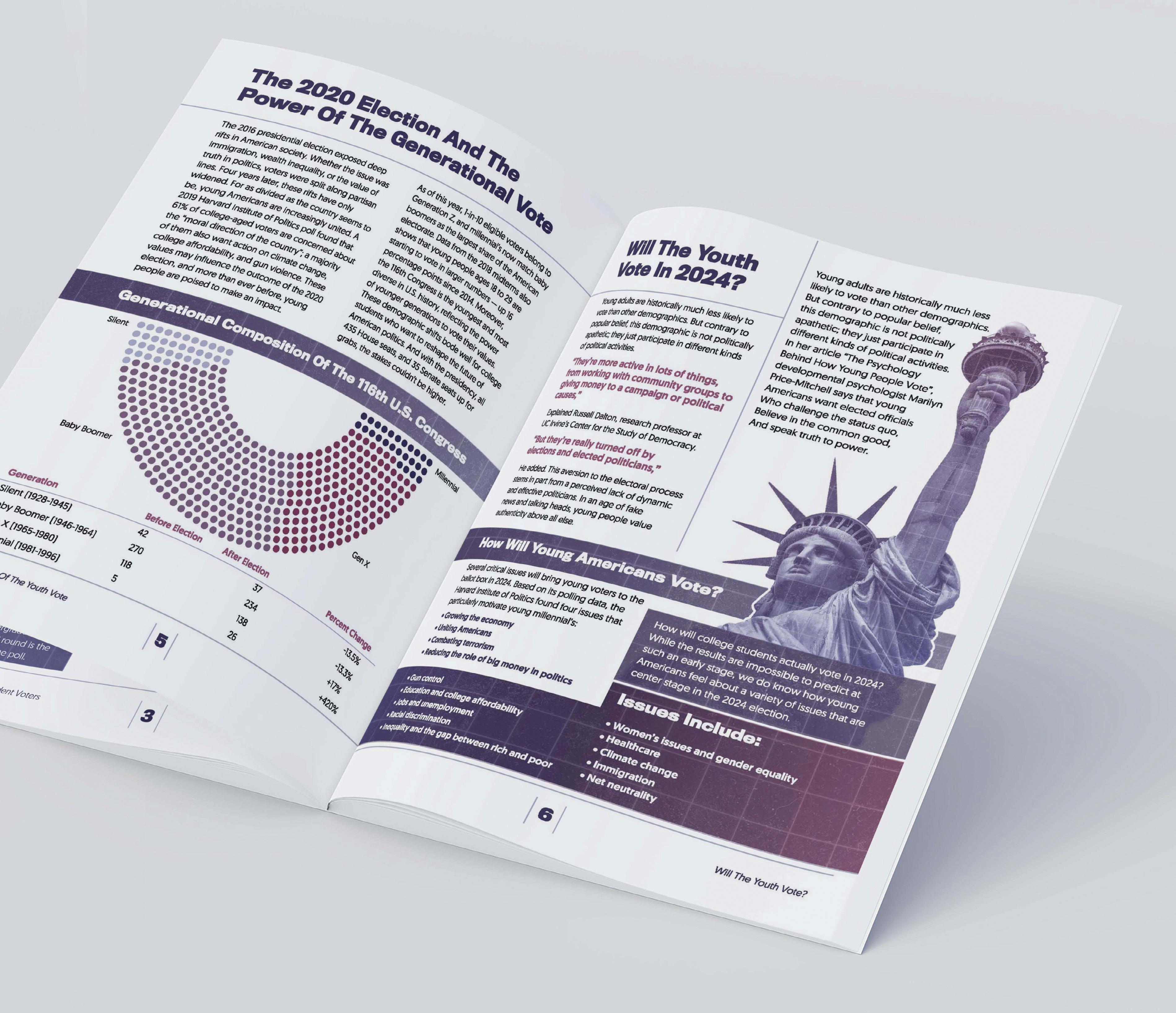 This campaign was created to advertise to young students the importance of voting. For this campaign, multiple forms of media were created including 3D Billboards, a voting tradeshow booth, a mirrored bus shelter advertisement, and a magazine featuring information about voting and how to vote.