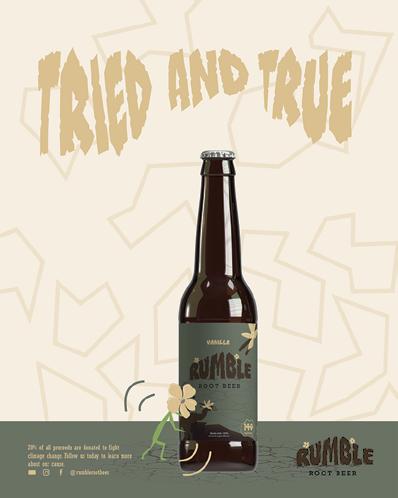 Rumble Root Beer is a fictional soda company based in the Southwest United States needing a rebrand for their packaging, along with print ads to promote their original, cherry, and vanilla flavors. While promoting their brand, they wanted to emphasize that they are pro-earth, and donate 20% of their proceeds to fight climate change and give back.