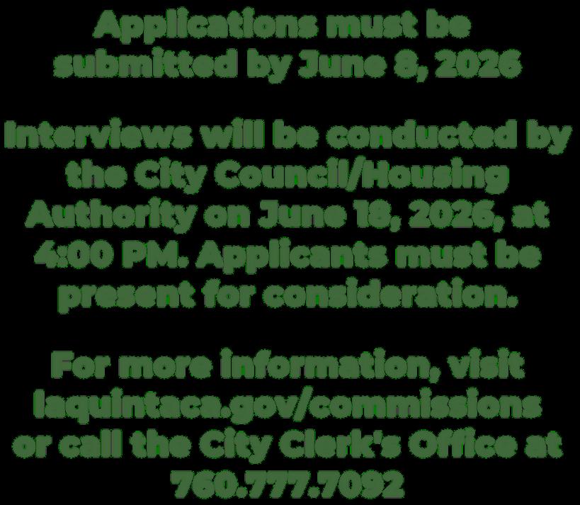 For more information, visit laquintaca.gov/commissions or call the City Clerk's Office at 760.777.7092