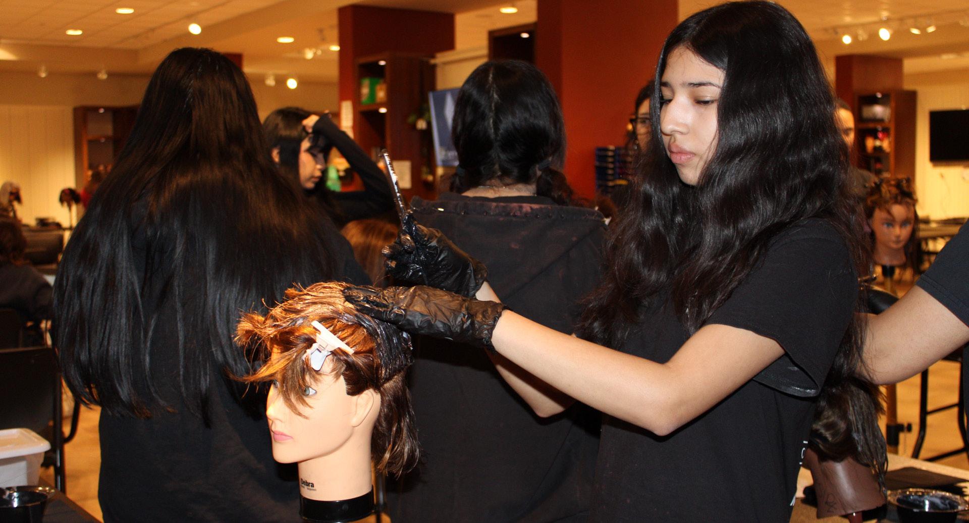 The two-year program prepares students for careers in cosmetology and barbering, teaching them the basics of hair, skin and nail care including coloring and thermal styling. The barbering curriculum is much the same, except that rather than doing nails, students give shaves.