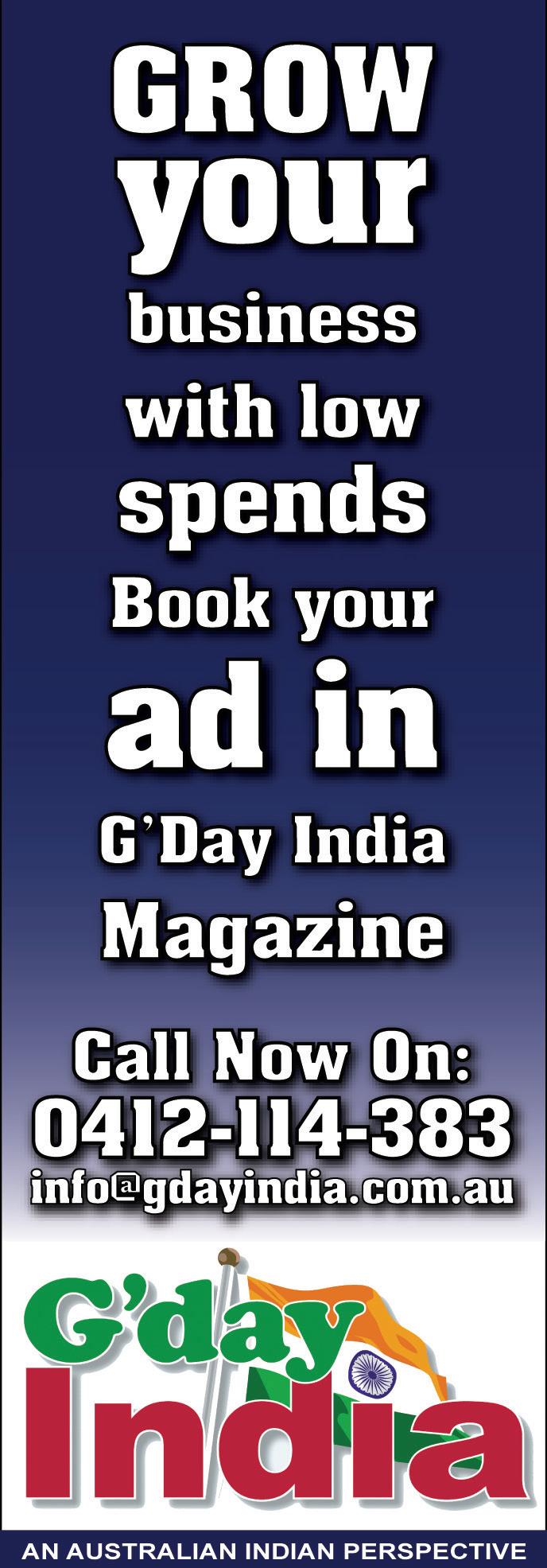 Opinions published in G’Day India are not necessarily endorsed by the publisher. No advertising design or material is to be reproduced without the written consent of the editor. All copyrights reserved to G’Day India. Articles, pictures, photographs and advertisements accepted by G’Day India Pty Ltd are on the understanding that the supplier of such materials has obtained all the relevant copyrights, permissions and grants permission to G’Day India Pty Ltd to publish them. Any liability arising from failure to obtain such permission lies entirely and exclusively with the supplier. Qualities of products and services advertised in G’Day India are not guaranteed by G’Day India Pty Ltd. NEWS