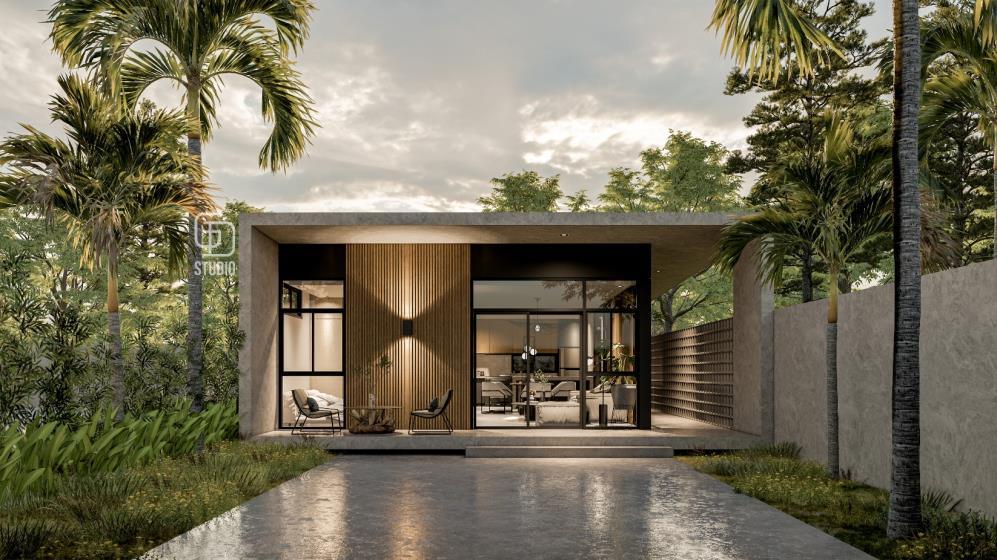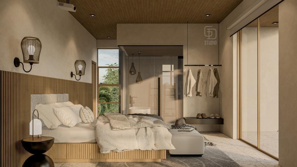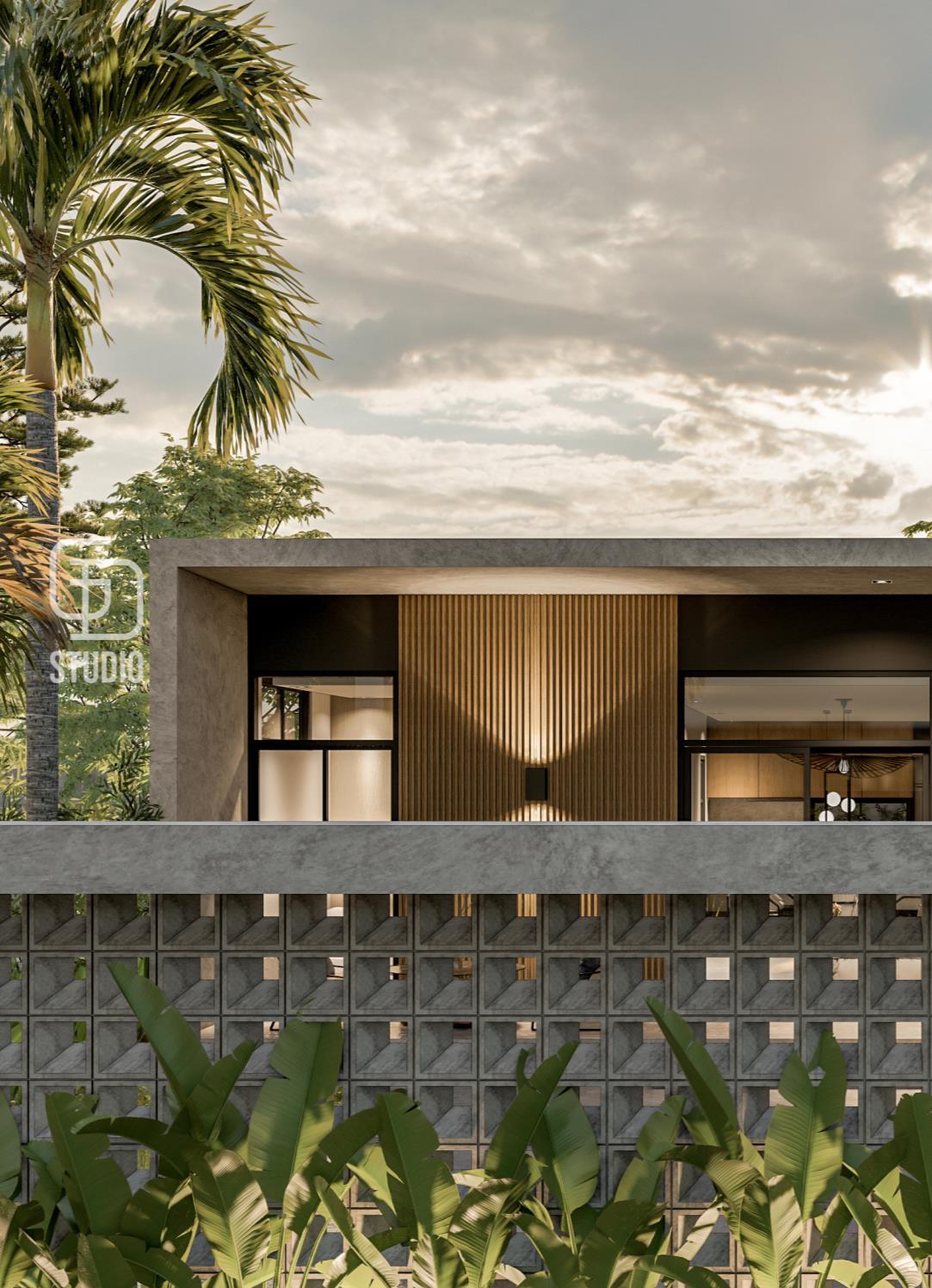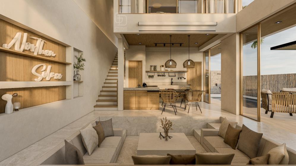 Emphasizes clean lines, natural materials and open floor plans characteristic of Modern Balinese. These elements will likely manifest in the villa’s structure, with a focus on creating a seamless connection between the interior and exterior spaces through the large glass windows onto private courtyards and plunge pool, blurring the lines between indoors and the lush tropical surroundings.