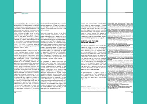 acclaimed exhibition. The rewards for cutting edge research via peer-reviewed papers and exhibitions impact positively on a researcher practitioner’s sense of self-esteem and perceived status amongst their peers (here I use the term ‘peer’ in it’s most common form, to mean someone belonging to the same societal [academic discipline] group especially based on age, grade, or status.8) This is not simply a matter of esteem or ego, a failure to publish in the ‘correct’ peer-reviewed journals (or not exhibiting in the equivalent galleries or museums) can lead to more than embarrassment, it can impact job status in academia and the loss of competitively-won commissions and sales for artists. If a publishing vehicle is found it may well be in second-tier journals or exhibition venues. For a discipline to take collaborative interdisciplinary work seriously the research needs to be recognised via dissemination (publication or exhibition) through journals/galleries that are highly regarded by each field. This appears to be a sweeping statement, but anecdotal evidence (gathered by questioning friends from the sciences and the arts over a number of years) shows that ‘specialist’ science publications rarely print papers co-authored with writers from other disciplines. In visual arts, and in the sciences, curators and editors often baulk at co-authors or exhibitors being given equal billing should they be from another discipline. Scientists are often asked to reference an artist collaborator in the body of ‘their’ paper, rather than naming them as a co-author; artists are under pressure to be named as ‘the artist’ and their collaborators differentiated by the term ‘with the scientist’. Interdisciplinary collaborations where one partner is an artist are notoriously difficult to fund and exhibit, commissioning bodies, cu162