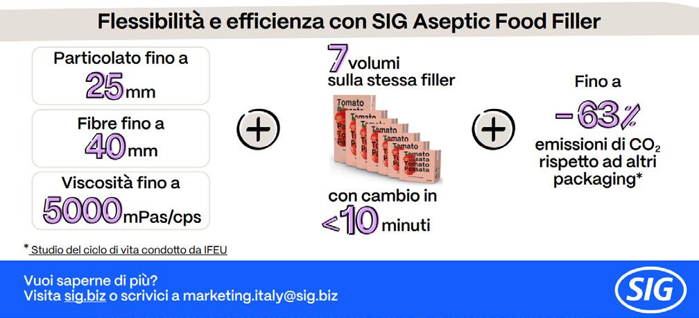 SIG Aseptic Food Filler offre numerosi vantaggi ai produttori, adattandosi perfettamente sia ai prodotti più semplici, come la passata, sia a quelli più complessi, come la polpa e ai pomodori a pezzetti. Inoltre, è ideale per prodotti a valore aggiunto, come ragù e sughi, che stanno registrando una crescita significativa, favorita dalla sempre maggiore richiesta dei consumatori di piatti semplici da preparare, senza sacrificare gusto e tradizione.